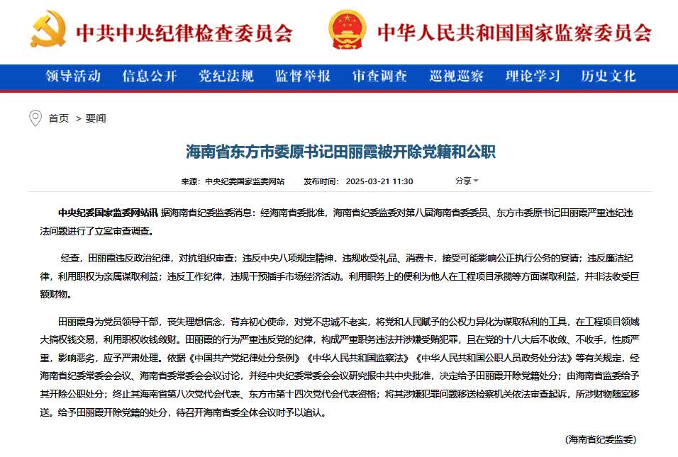 田麗霞身為黨員領導幹部,喪失理想信念,背棄初心使命,對黨不忠誠不老實,將黨和人民賦予的公權力異化為謀取私利的工具,在工程項目領域大搞權錢交易,利用職權收錢斂財。田麗霞的行為嚴重違反黨的紀律,構成嚴重職務違法並涉嫌受賄犯罪,且在黨的十八大後不收斂、不收手,性質嚴重,影響惡劣,應予嚴肅處理。依據《中國共產黨紀律處分條例》《中華人民共和國監察法》《中華人民共和國公職人員政務處分法》等有關規定,經海南省紀委常委會會議、海南省委常委會會議討論,並經中央紀委常委會會議研究報中共中央批准,決定給予田麗霞開除黨籍處分;由海南省監委給予其開除公職處分;終止其海南省第八次黨代會代表、東方市第十四次黨代會代表資格;將其涉嫌犯罪問題移送檢察機關依法審查起訴,所涉財物隨案移送。給予田麗霞開除黨籍的處分,待召開海南省委全體會議時予以追認。