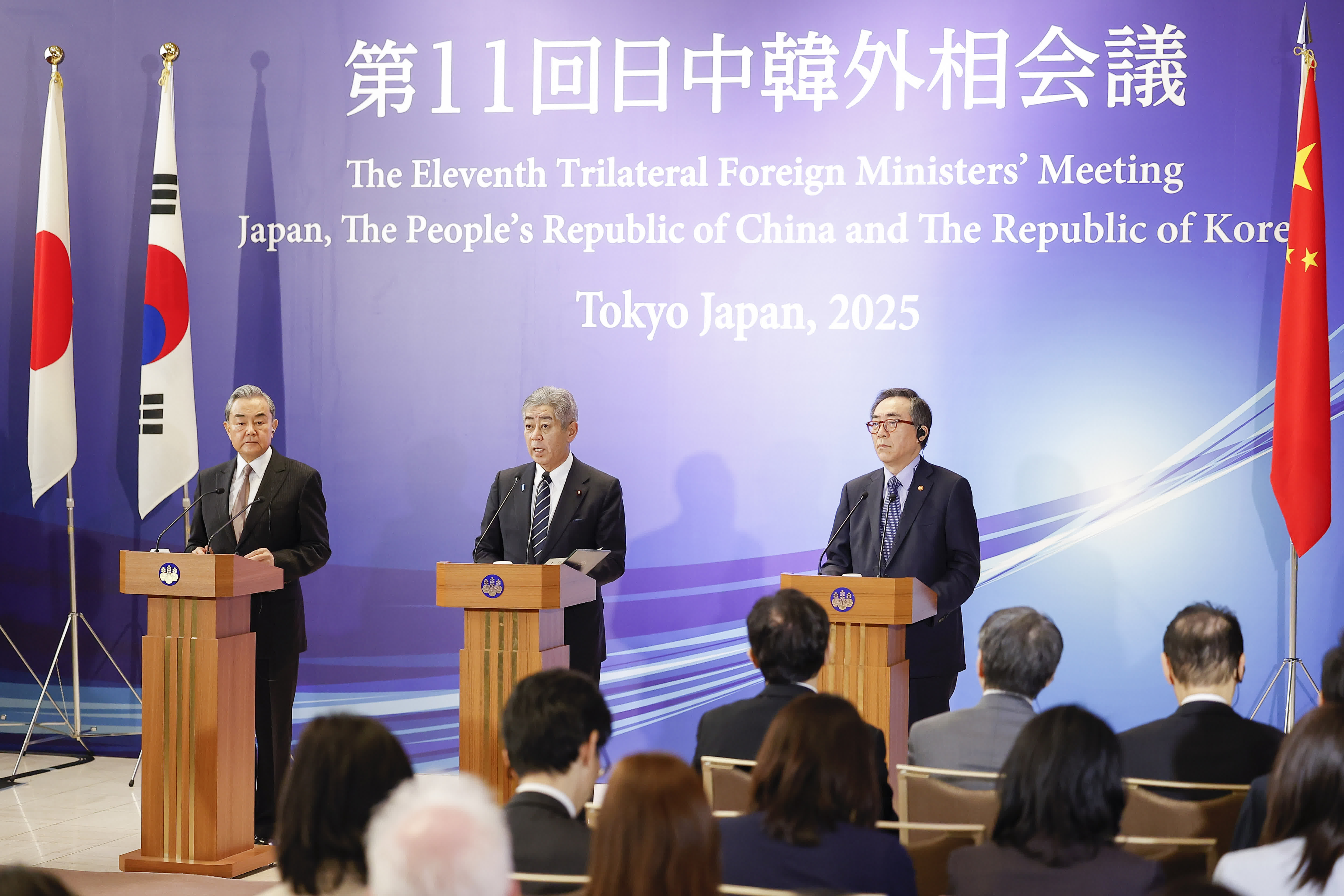 新華社報道,3月22日,中共中央政治局委員、外交部長王毅在東京出席第11次中日韓外長會後同日本外相岩屋毅、韓國外長趙兌烈共同會見記者。