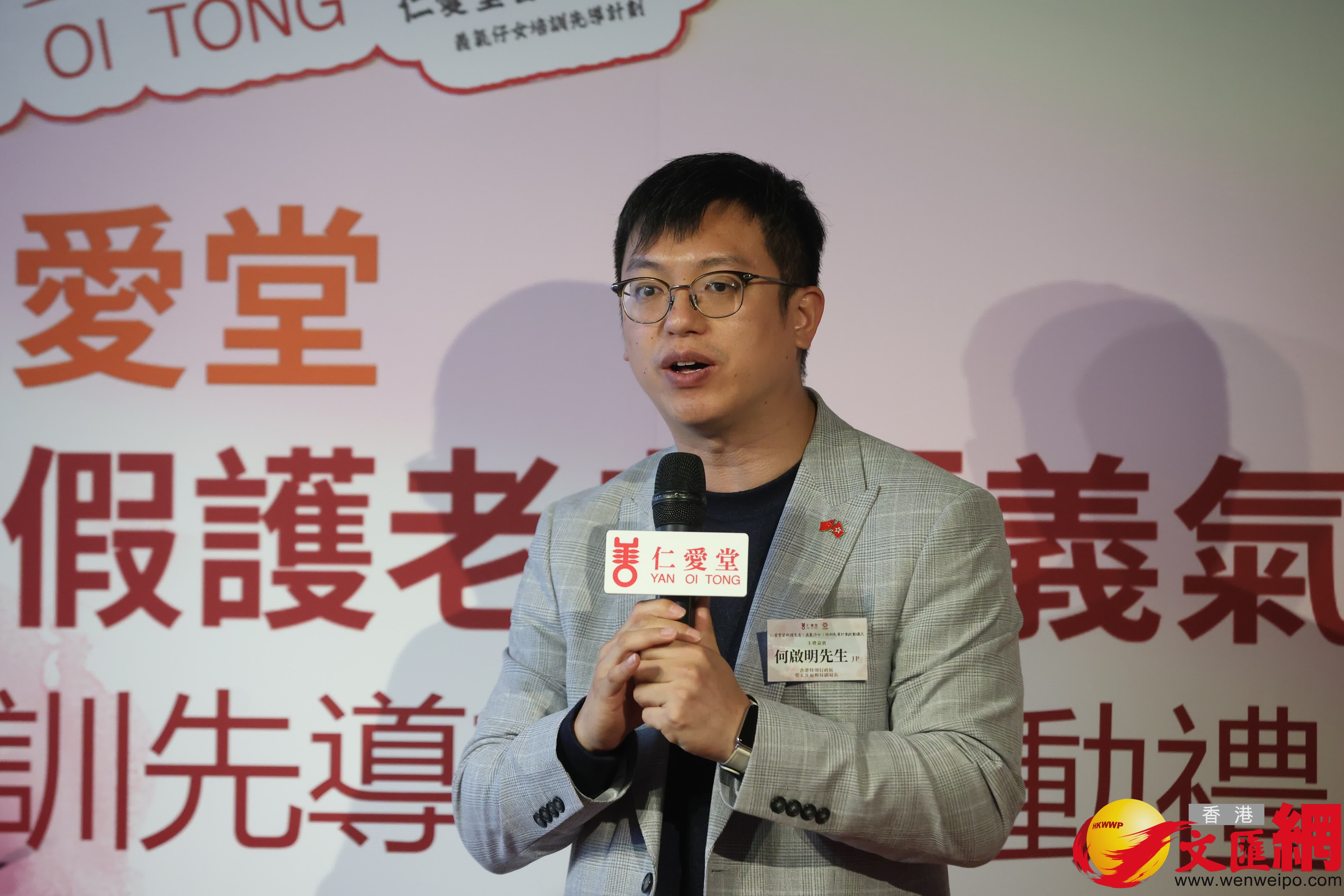 香港文匯報訊(記者 張茗)為應對香港人口老化及護老者的壓力,仁愛堂推出「替假護老者『義氣仔女』培訓先導計劃」,並在今日(22日)舉行啟動儀式。勞工及福利局副局長何啟明表示,目前香港已經有超過200萬名60歲以上的長者,希望能找到更多有心人士成為「義氣子女」,幫忙「落手落腳」照顧長者,達到精準扶貧的目標。