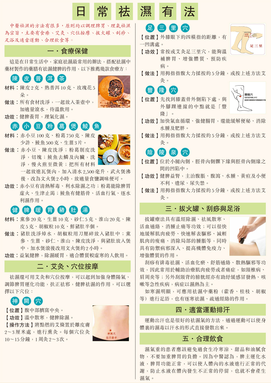 祛濕重點:健脾利濕。在祛除體內多餘水濕的同時,還要把脾胃功能健全起來,使身體運化水濕的功能恢復正常,保證體內濕氣能順利排出。