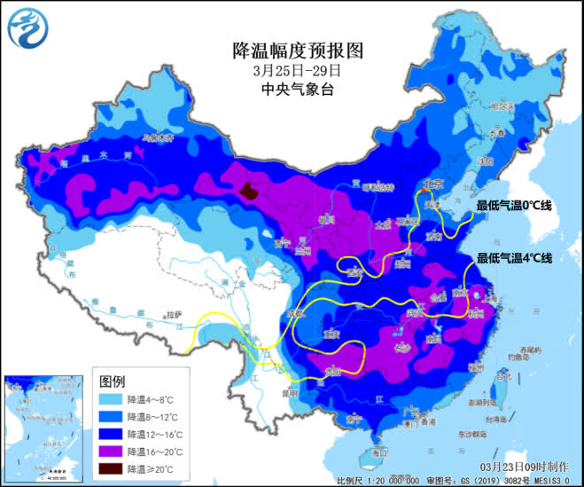 預計3月25日至29日,除青藏高原外,全國大部地區氣溫先後下降8~12℃,西北地區東部、華北西部、黃淮南部、江淮、江南等地降溫幅度可達14~16℃,局部地區日最高氣溫降幅超過20℃。降溫過後,30日早上最低氣溫0℃線將位於華北中部至陝西南部一帶;華北地區日最高氣溫在10~15℃。