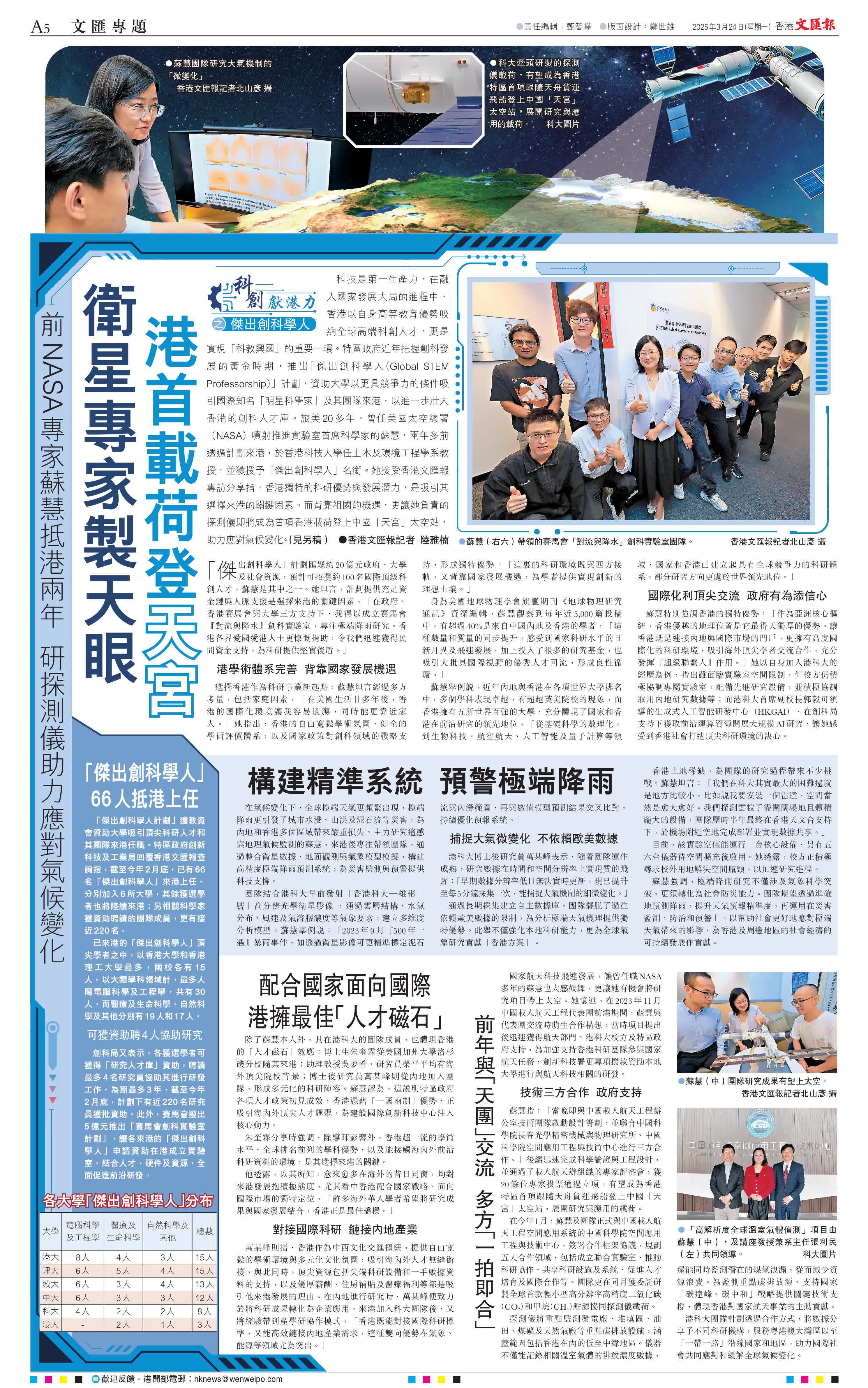 (香港文匯報記者 陸雅楠)科技是第一生產力,在融入國家發展大局的進程中,香港以自身高等教育優勢吸納全球高端科創人才,更是實現「科教興國」的重要一環。特區政府近年把握創科發展的黃金時期,推出「傑出創科學人(Global STEM Professorship)」計劃,資助大學以更具競爭力的條件吸引國際知名「明星科學家」及其團隊來港,以進一步壯大香港的創科人才庫。旅美20多年、曾任美國太空總署(NASA)噴射推進實驗室首席科學家的蘇慧,兩年多前透過計劃來港,於香港科技大學任土木及環境工程學系教授,並獲授予「傑出創科學人」名銜。她接受香港文匯報專訪分享指,香港獨特的科研優勢與發展潛力,是吸引其選擇來港的關鍵因素。而背靠祖國的機遇,更讓她負責的探測儀即將成為首項香港載荷登上中國「天宮」太空站,助力應對氣候變化。