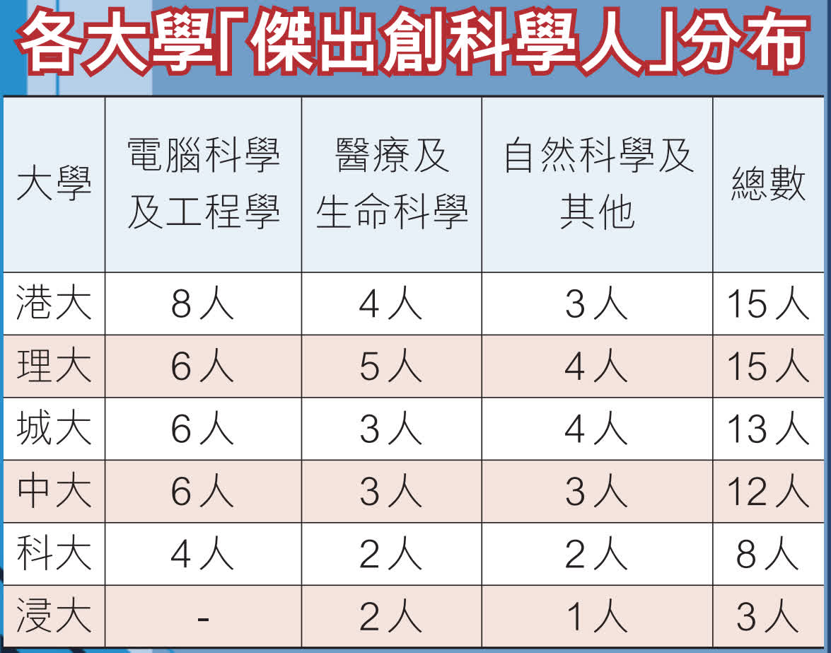 已來港的「傑出創科學人」頂尖學者之中,以香港大學和香港理工大學最多,兩校各有15人。以大類學科領域計,最多人屬電腦科學及工程學,共有30人,而醫療及生命科學、自然科學及其他分別有19人和17人。
