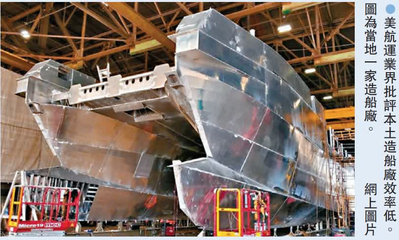 彭博通訊社引述美國多間航運公司代表稱,公司雖然願意購買或租用美國製造的船隻,但美國造船廠效率低,需時多年才能滿足需求。美國出口歐洲建築和農業設備承運商大西洋貨櫃航運公司(ACL)舉例稱,該公司2012年需採購一批大型貨櫃船,美國造船廠當時均表示,需時至少7年才能交付訂單。ACL轉向中國造船廠,很快便以極具市場競爭力的價格,迅速獲得高性價比的貨櫃船投入營運。