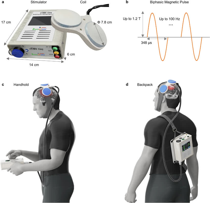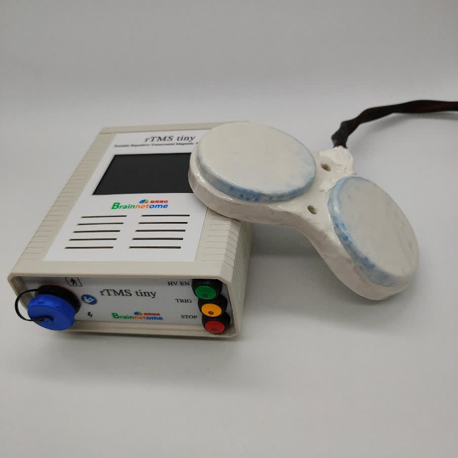 相較於電休克(ECT)等閾上調控手段,TMS無需麻醉、副作用小、安全性高,在腦健康領域展現出巨大潛力。重複經顱磁刺激已被美國食品藥品監督管理局(FDA)批准用於抑鬱症(成人和青少年)、偏頭痛、強迫症和煙癮的治療,其它疾病如精神分裂、帕金森、卒中等的治療和康復應用正在探索進行中。然而,傳統rTMS的脈衝發放頻率很高(可達50 Hz以上),在線圈中產生幾千安培的電流,設備功率在幾千瓦到幾十千瓦,配套的電源和散熱設施使得設備重達數十公斤,極大限制了其在臨床和科研中的應用。如何將rTMS小型化、甚至實現可穿戴,是科研人員和工程師久攻不克的技術難題。中國科學院自動化研究所的科研人員此次將設備的功耗、重量降至進口商用設備的10%以下,並保持和現有傳統商業TMS設備十分接近的刺激強度。