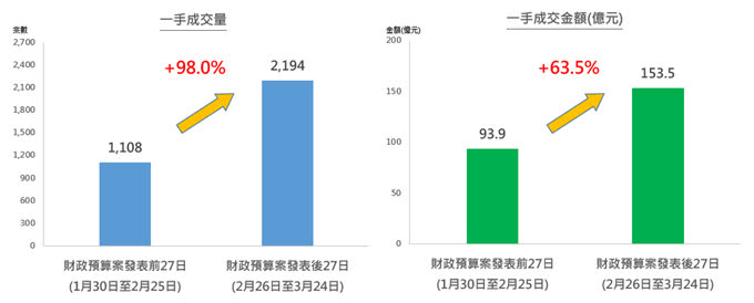 香港文匯報訊 (記者 梁悦琴)財政預算案於上月26日發表,至今滿一個月。財案宣布將400萬元或以下物業印花稅降低至100元,加上近月港股造好,利好樓市氣氛,發展商趁勢推出多個新盤,市場反應熱烈,一手無論成交量抑或成交金額均較財案公布前激增。據美聯物業研究中心綜合<<一手住宅物業銷售資訊網>>資料及市場消息,以財政預算案發表後(2月26日至3月24日)的27日計算,全港新盤成交量共錄2,194宗,比起財案發表前27日(1月30日至2月25日)的1,108宗大升約98%。金額方面,由財案發表前27日一手成交涉及約93.9億元,升至發表後27日約153.5億元,升幅亦達63.5%。宗數升幅較金額顯著,主要因財案後推出的全新盤以中細價為主,並導致平均每宗金額由發表前約847萬元減至發表後約700萬元,減少逾17%。