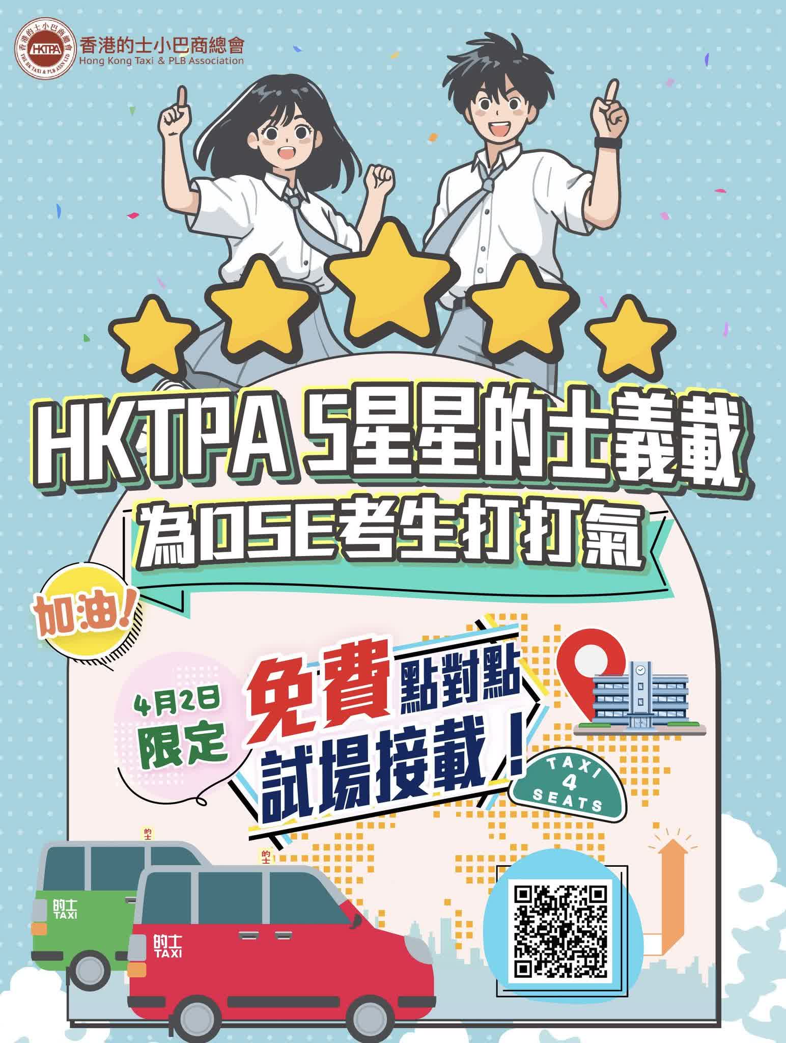 (大公文匯全媒體報道)文憑試筆試即將開考,香港的士小巴商總會(HKTPA)近日特別發起「五星星的士義載」計劃,於下周三(4月2日)中文科應考日,為應屆DSE考生提供免費的士接送服務,協助考生順利抵達考場。