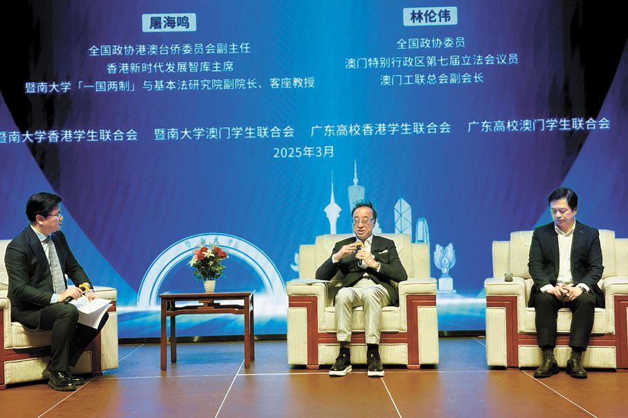 香港文匯報訊(記者 敖敏輝 廣州報道)27日,在暨南大學舉行的全國兩會精神分享會上,全國政協港澳台僑委員會副主任、香港新時代發展智庫主席屠海鳴和全國政協委員、澳門特區立法會議員林倫偉與近300名港澳學生和暨大教師面對面,傳達學習2025年全國兩會精神,分享參會體會心得。