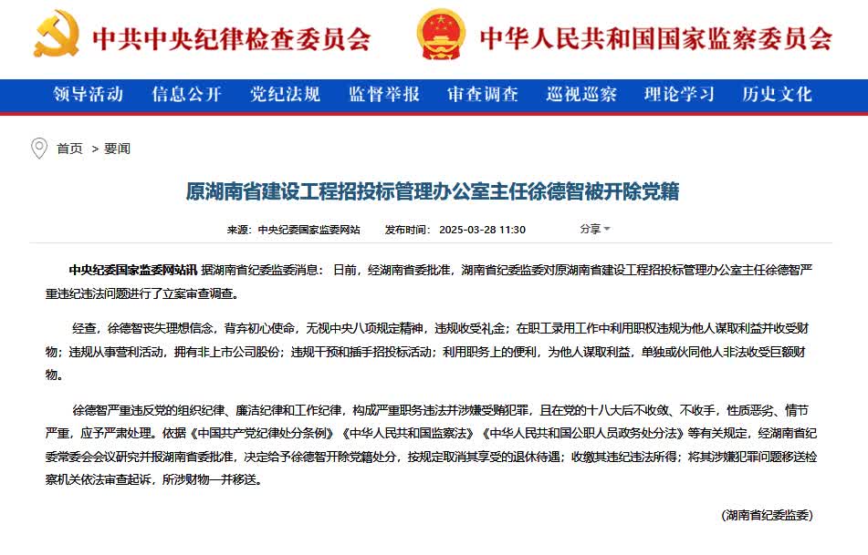 據湖南省紀委監委消息: 日前,經湖南省委批准,湖南省紀委監委對原湖南省建設工程招投標管理辦公室主任徐德智嚴重違紀違法問題進行了立案審查調查。