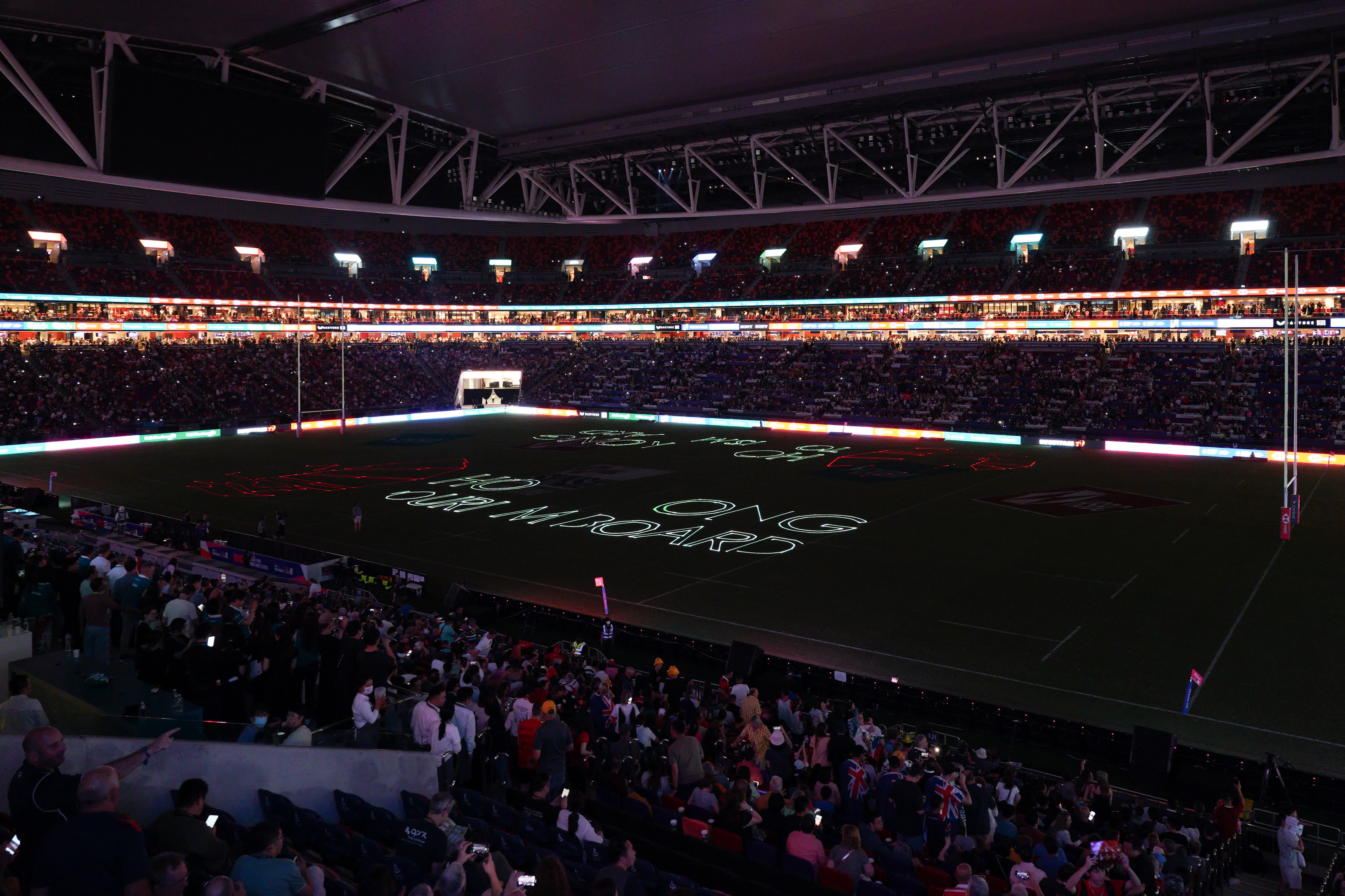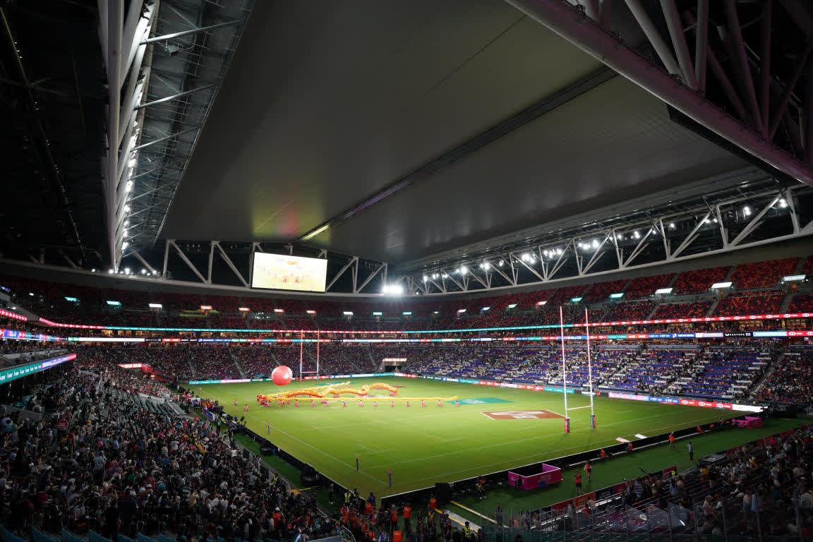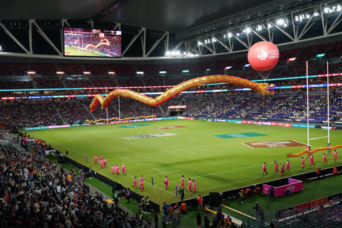 (大公文匯全媒體記者陳子萌報道)2025香港國際七人欖球賽(七欖)開幕典禮於今日(28日)下午6時40分左右在啟德體育園主場館舉行,飛龍舞獅、啦啦隊熱舞、絢爛激光秀表演點燃全場。