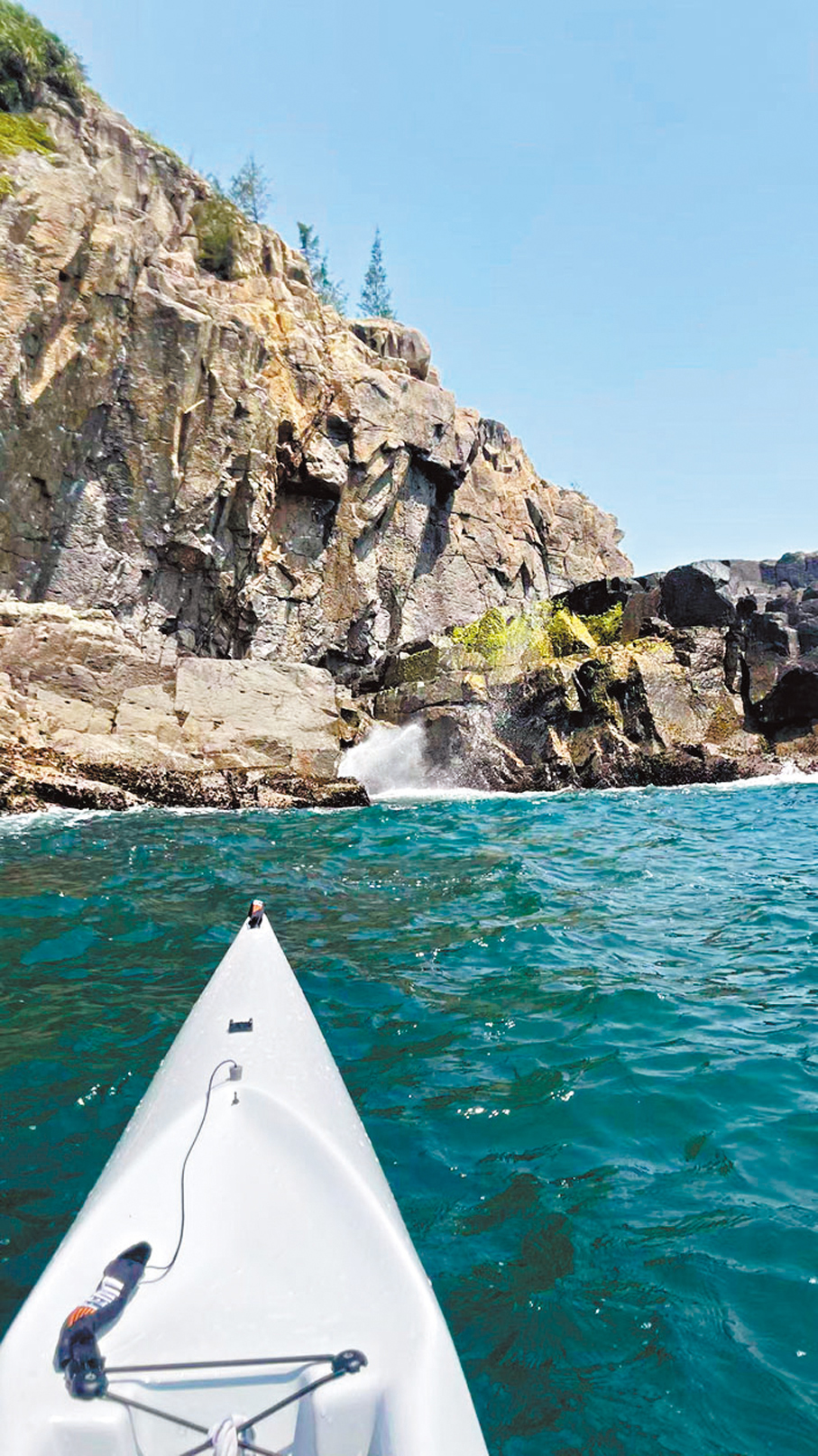 登上清水灣郊野公園山頂、北眺西貢,是極美麗如畫的仙境,而微風二級的好天,沿山下的海岸舟行,是香港海岸風光帶的一個代表。先是可從海上看海岸上的樹木,特別秀美、修長、婀娜多姿;接着是礁石浪旁一塊如沉思智者的海岸石;然後是白浪滔天環繞的黑礁石及有新鮮山石傾瀉的陡坡,巨大的海蝕洞一個接一個,海浪撞進洞穴聲音如低音炮;然後又是有很多海貝和植物的礁石;不知不覺間已到了波平如鏡的綠蛋島,是獨木舟菜鳥的集中地。