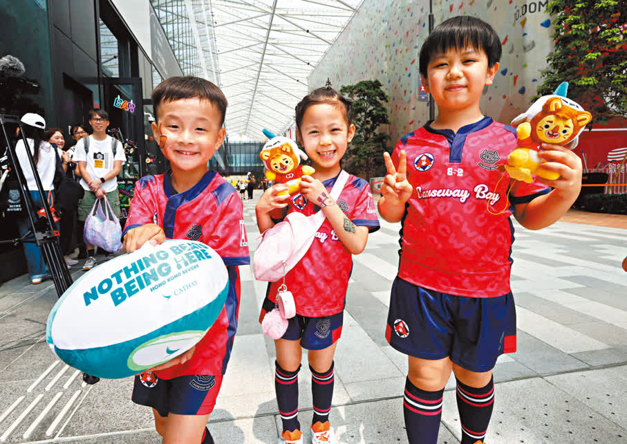 昨日開鑼的國際七人欖球賽吸引了不少「小球迷」到場。今年就讀小一的Theo、Justina、Hayden,專門請假與家長到場感受「七欖熱」。他們表示,整場比賽非常精彩,但最喜歡的還是場內給12歲以下兒童設計的小型欖球比賽,「平時的欖球賽只能在觀眾席觀看,但這次能夠上場參賽,十分開心。」