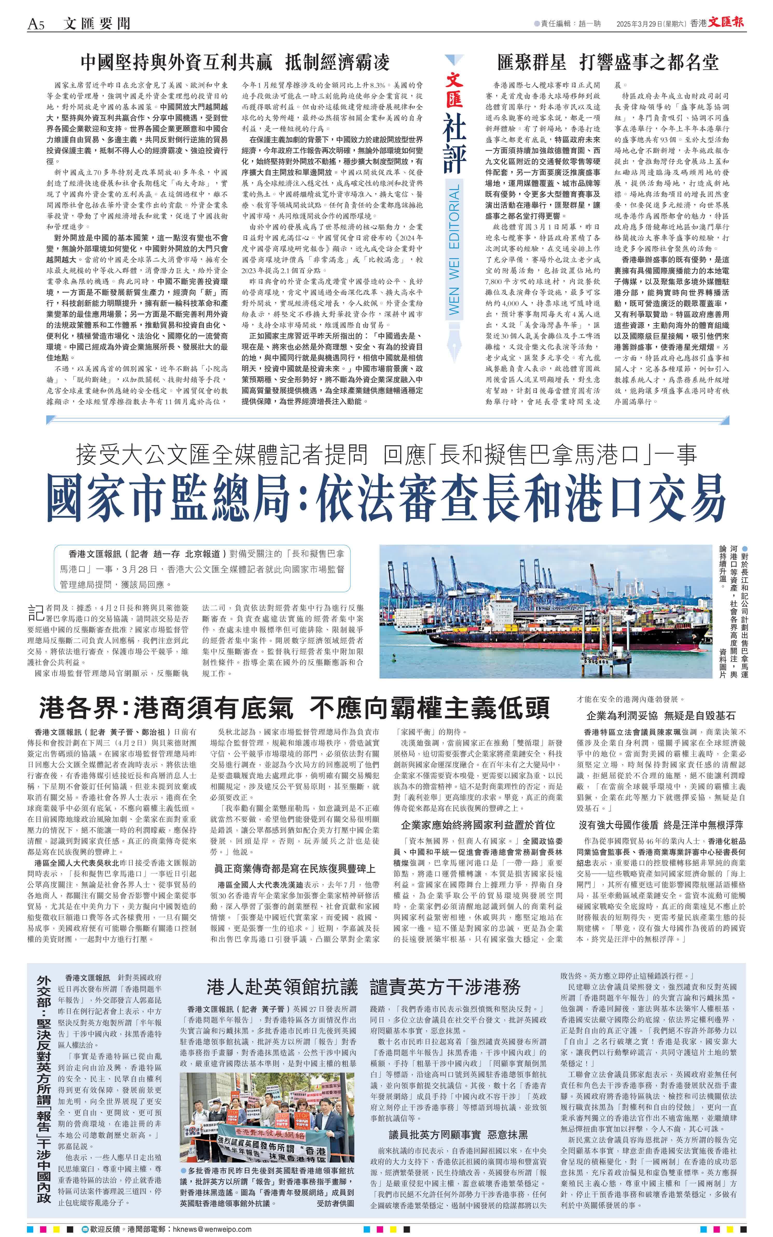 香港文匯報訊(記者 黃子晉、鄭治祖)日前有傳長和會按計劃在下周三(4月2日)與貝萊德財團簽定出售碼頭的協議。在國家市場監督管理總局昨日回應大公文匯全媒體記者查詢時表示,將依法進行審查後,有香港傳媒引述接近長和高層消息人士稱,下星期不會簽訂任何協議,但並未提到放棄或取消有關交易。香港社會各界人士表示,港商在全球商業競爭中必須有底氣,不應向霸權主義低頭。在目前國際地緣政治風險加劇、企業家在面對重重壓力的情況下,絕不能讓一時的利潤矇蔽,應保持清醒,認識到對國家責任感。真正的商業傳奇從來都是寫在民族復興的豐碑上。