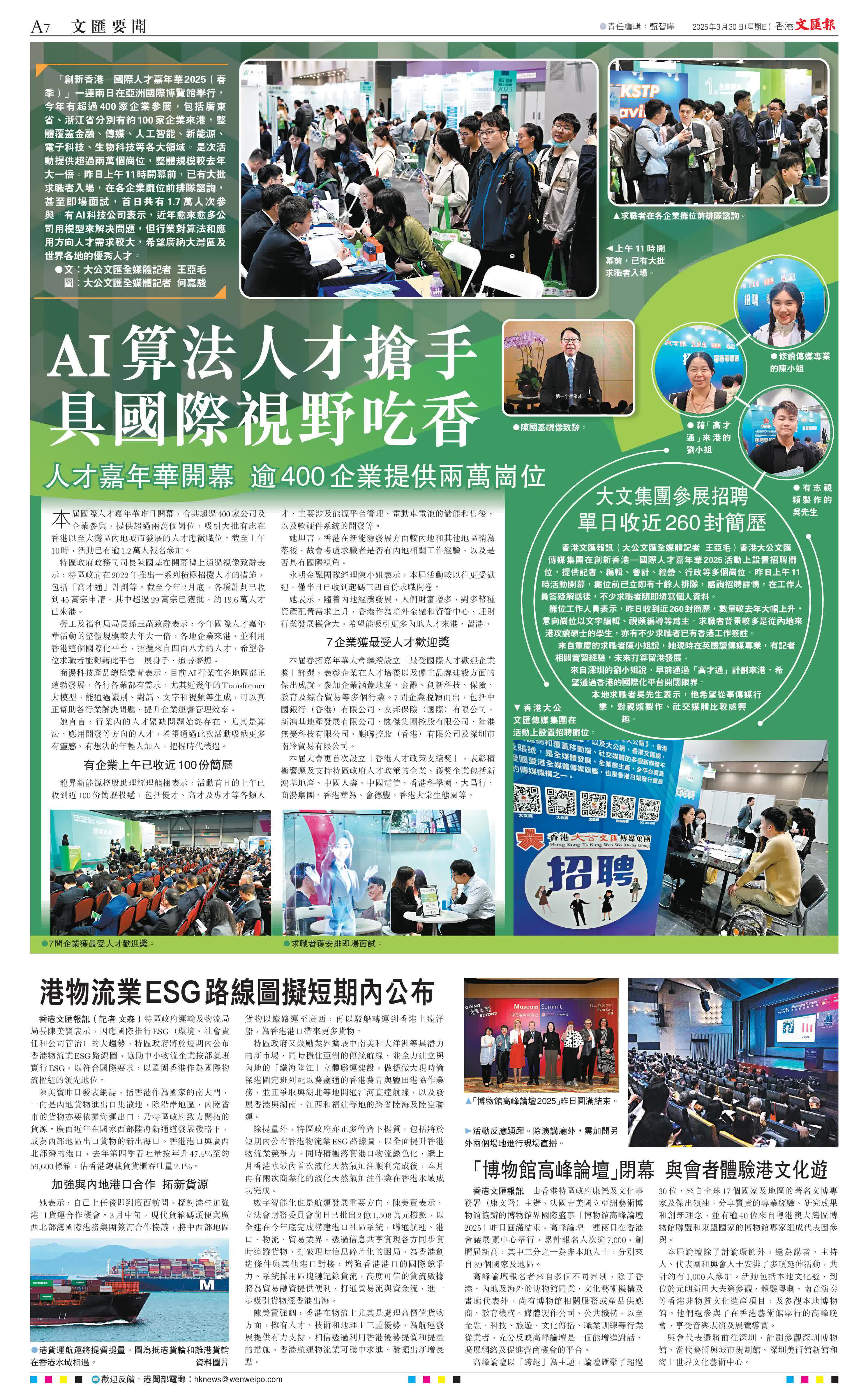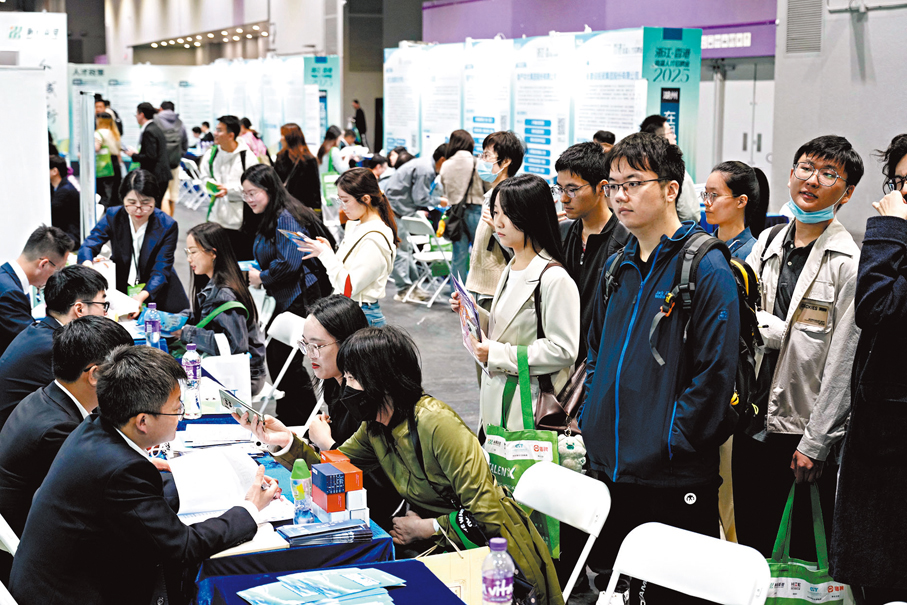 (大公文匯全媒體記者 王亞毛)「創新香港─國際人才嘉年華2025(春季)」一連兩日在亞洲國際博覽館舉行,今年有超過400家企業參展,包括廣東省、浙江省分別有約100家企業來港,整體覆蓋金融、傳媒、人工智能、新能源、電子科技、生物科技等各大領域。是次活動提供超過兩萬個崗位,整體規模較去年大一倍。昨日上午11時開幕前,已有大批求職者入場,在各企業攤位前排隊諮詢,甚至即場面試,首日共有1.7萬人次參與。有AI科技公司表示,近年愈來愈多公司用模型來解决問題,但行業對算法和應用方向人才需求較大,希望廣納大灣區及世界各地的優秀人才。