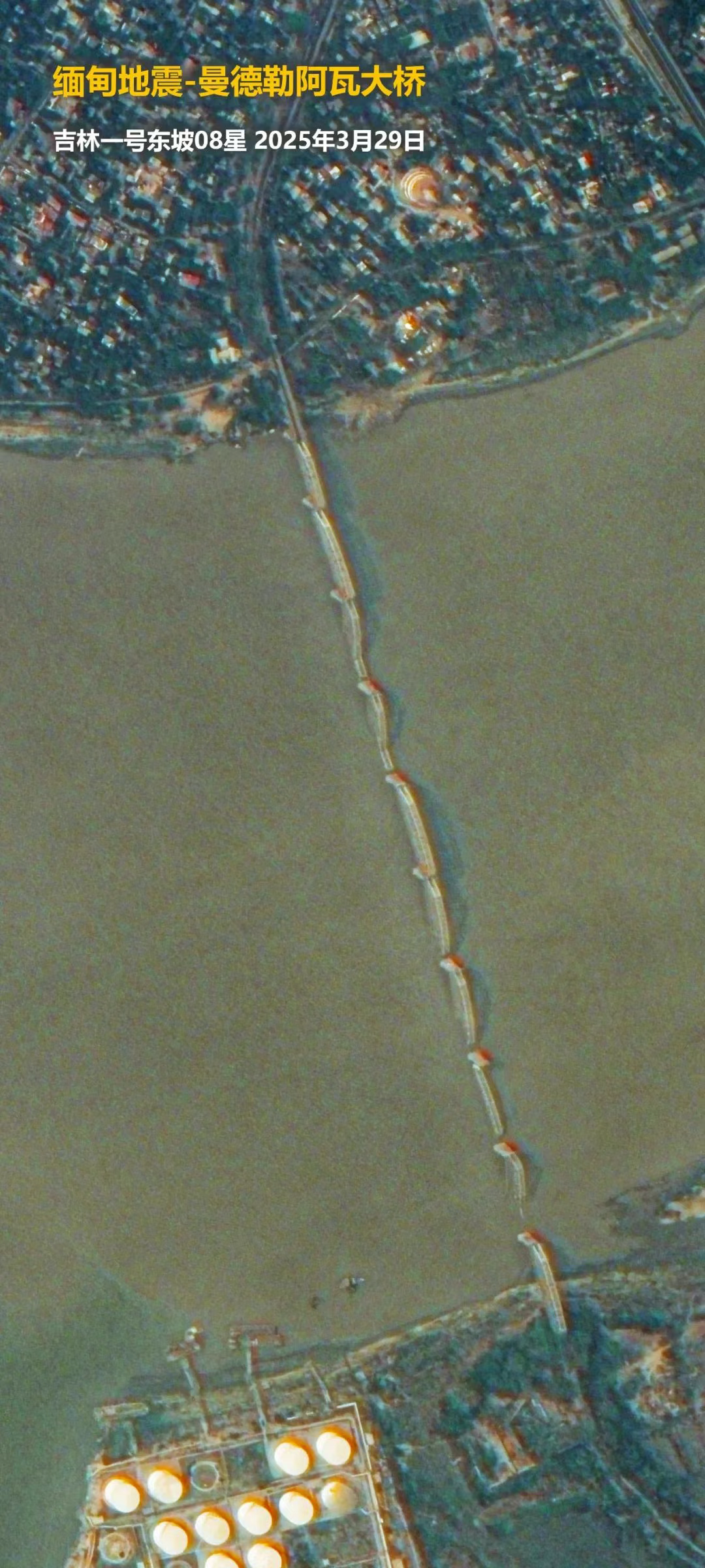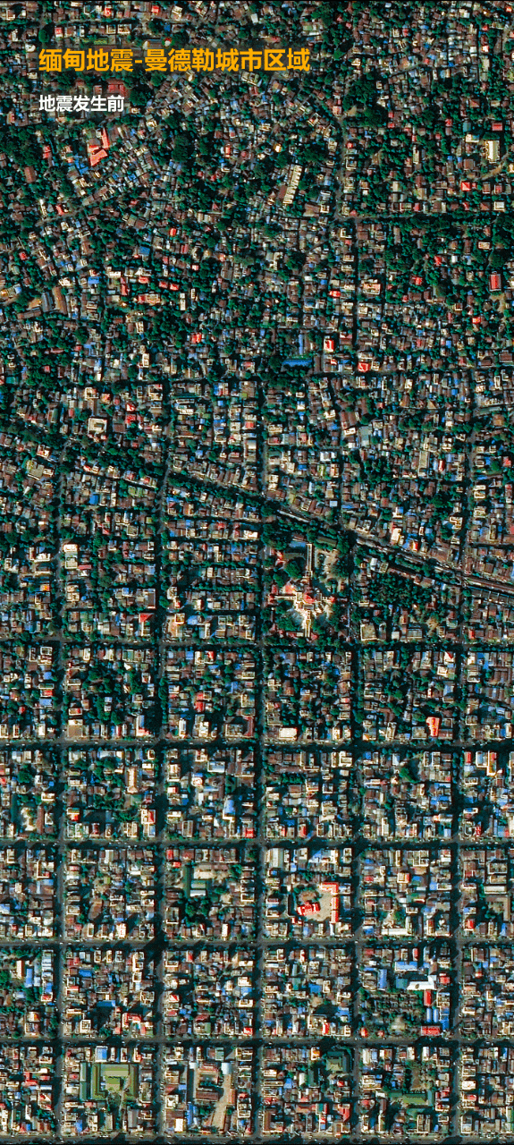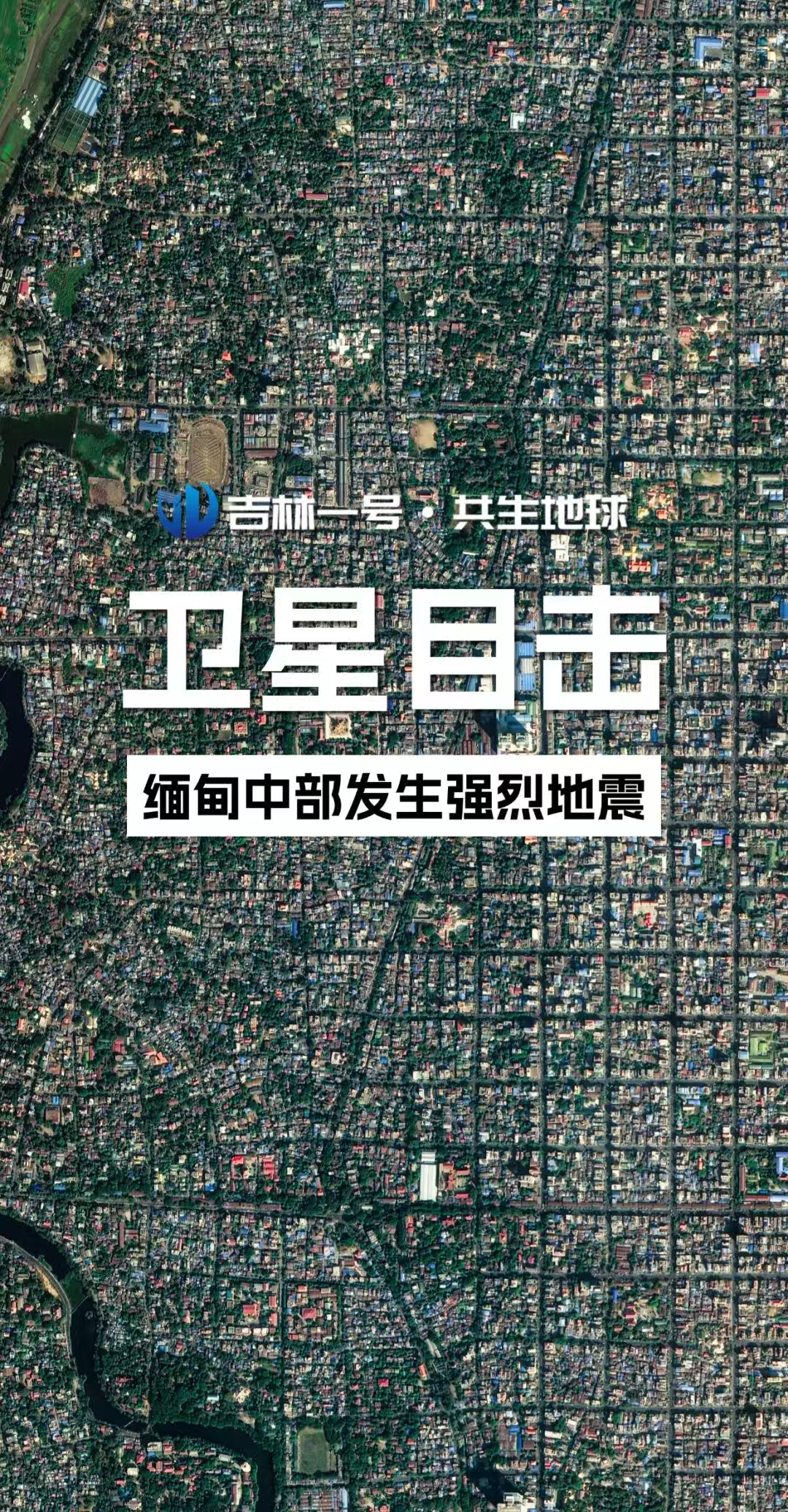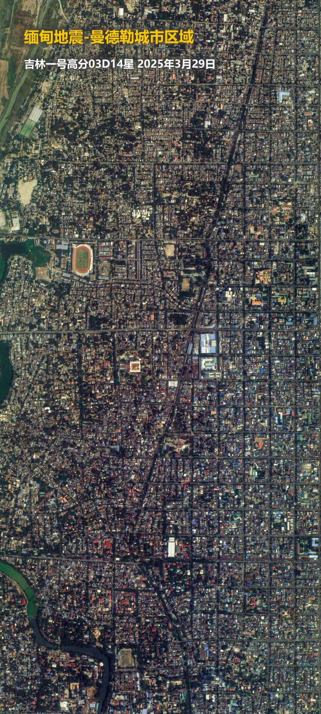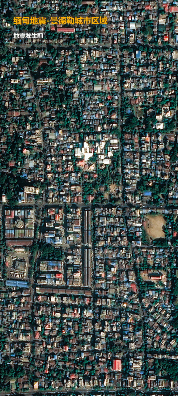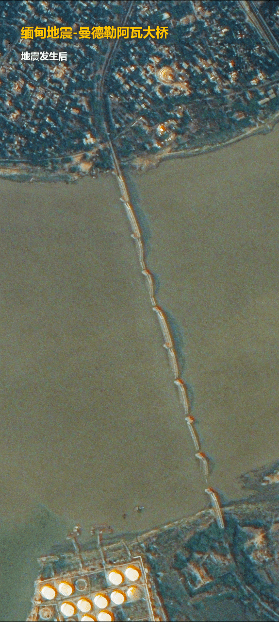 2025年3月28日,緬甸發生強震造成了重大人員傷亡和財產損失。地震發生後,吉林一號衛星迅速響應,緊急調度過境災區,拍攝了高分辨率的現場畫面,並在成像後第一時間提供給相關單位,助力抗洪救災工作。