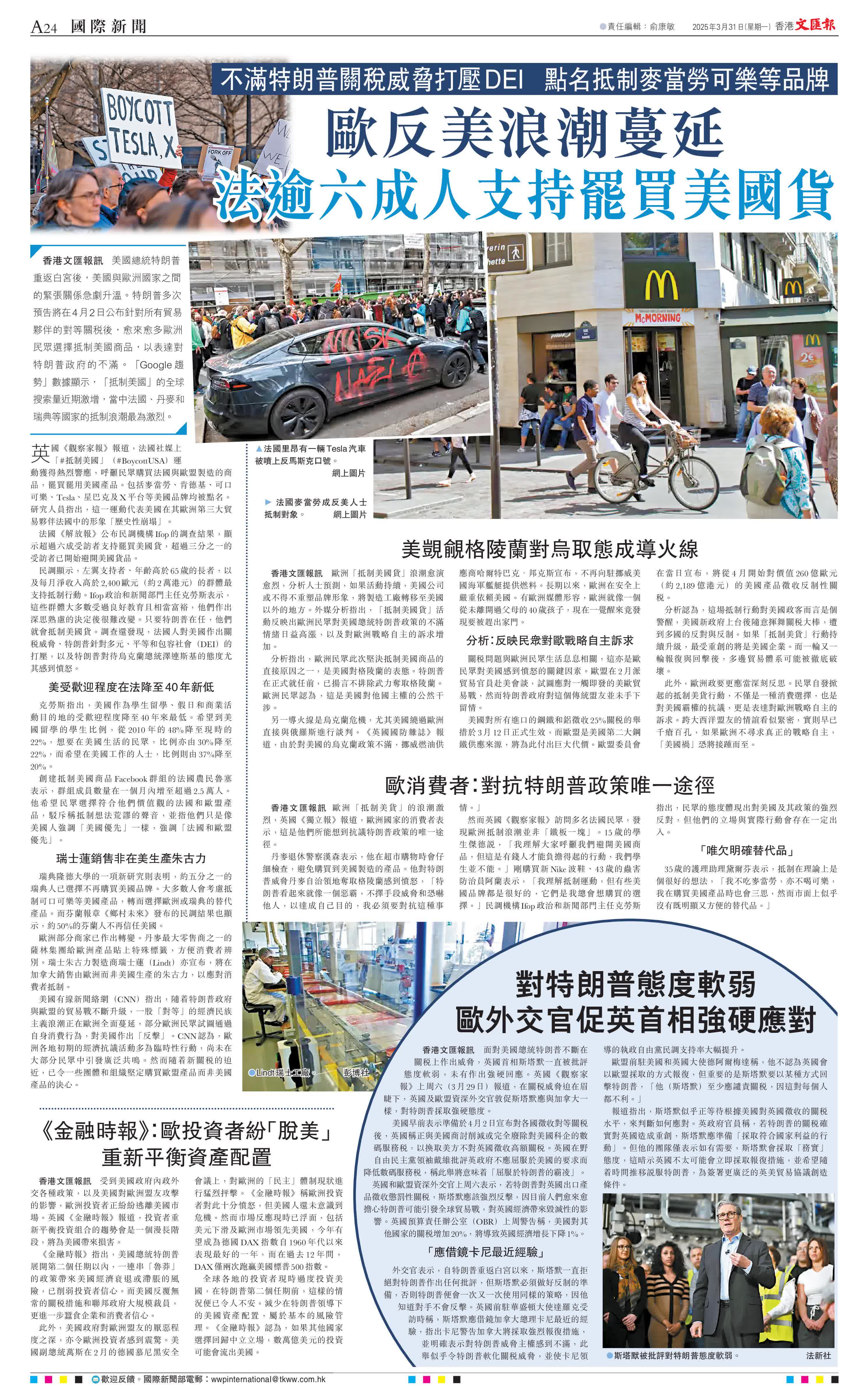 英國《觀察家報》報道,法國社媒上「#抵制美國」(#BoycottUSA)運動獲得熱烈響應,呼籲民眾購買法國與歐盟製造的商品,罷買罷用美國產品。包括麥當勞、肯德基、可口可樂、Tesla、星巴克及X平台等美國品牌均被點名。研究人員指出,這一運動代表美國在其歐洲第三大貿易夥伴法國中的形象「歷史性崩塌」。