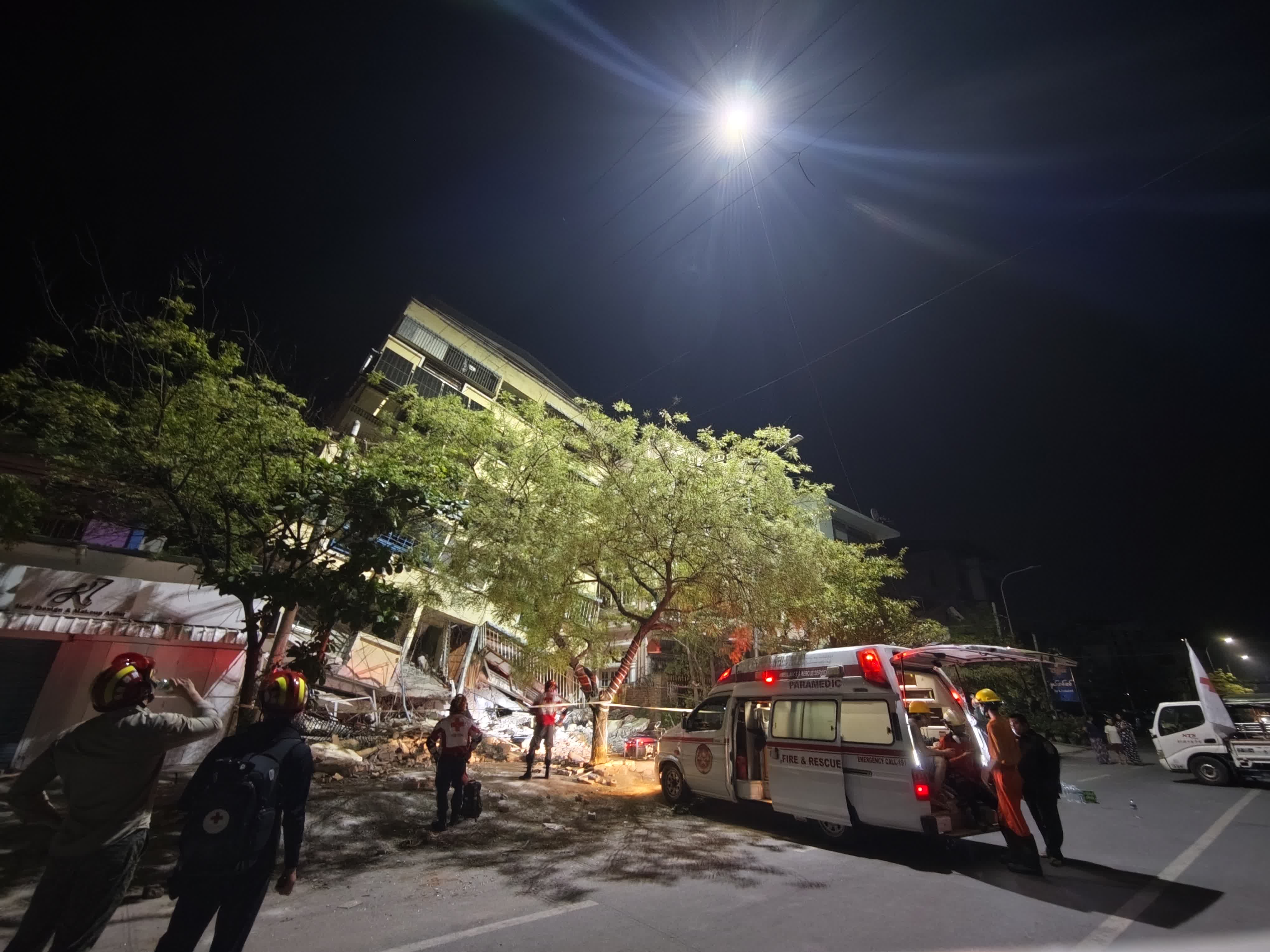 (香港文匯網記者 丁春麗)3月31日晚,緬甸曼德勒68-41地區,中國紅十字國際救援隊開啟無人機照明,連夜破拆打開通道進行救援。