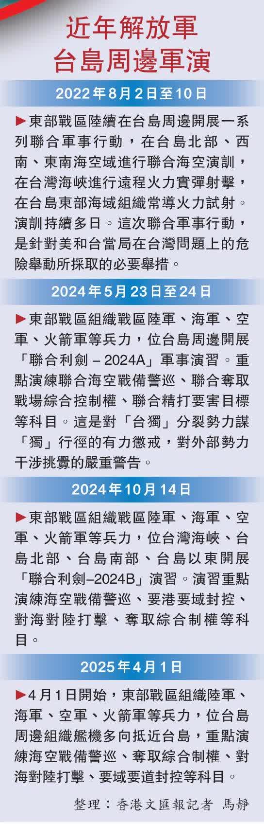 (香港文匯報記者 馬靜 北京報道)4月1日開始,中國人民解放軍東部戰區組織陸軍、海軍、空軍、火箭軍等兵力,位台島周邊開展聯合演訓,組織艦機多向抵近台島。東部戰區新聞發言人施毅陸軍大校表示,演訓重點演練海空戰備警巡、奪取綜合制權、對海對陸打擊、要域要道封控等科目,檢驗戰區部隊聯合作戰實戰能力。