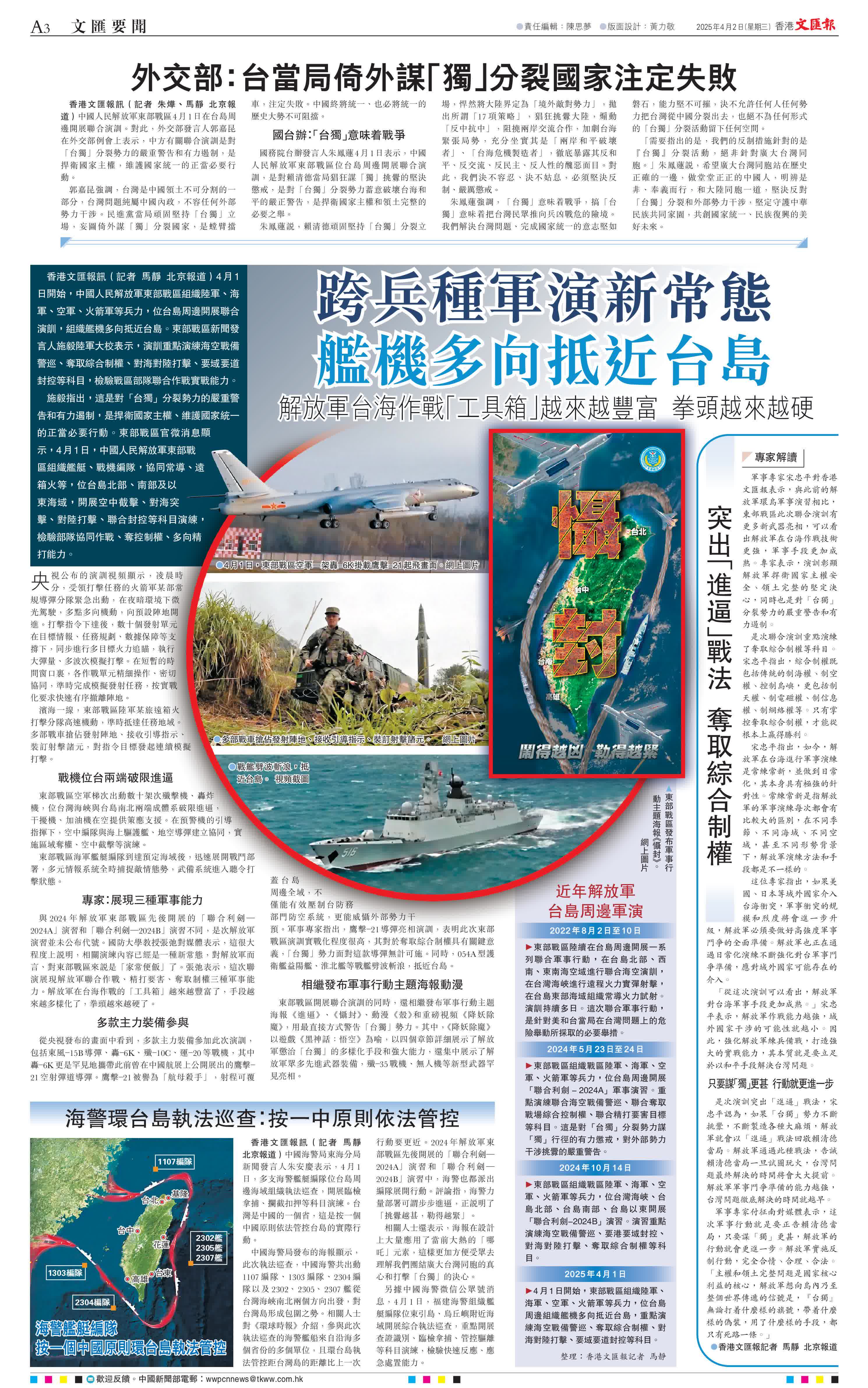 (香港文匯報記者 朱燁、馬靜 北京報道)中國人民解放軍東部戰區4月1日在台島周邊開展聯合演訓。對此,外交部發言人郭嘉昆在外交部例會上表示,中方有關聯合演訓是對「台獨」分裂勢力的嚴重警告和有力遏制,是捍衛國家主權,維護國家統一的正當必要行動。