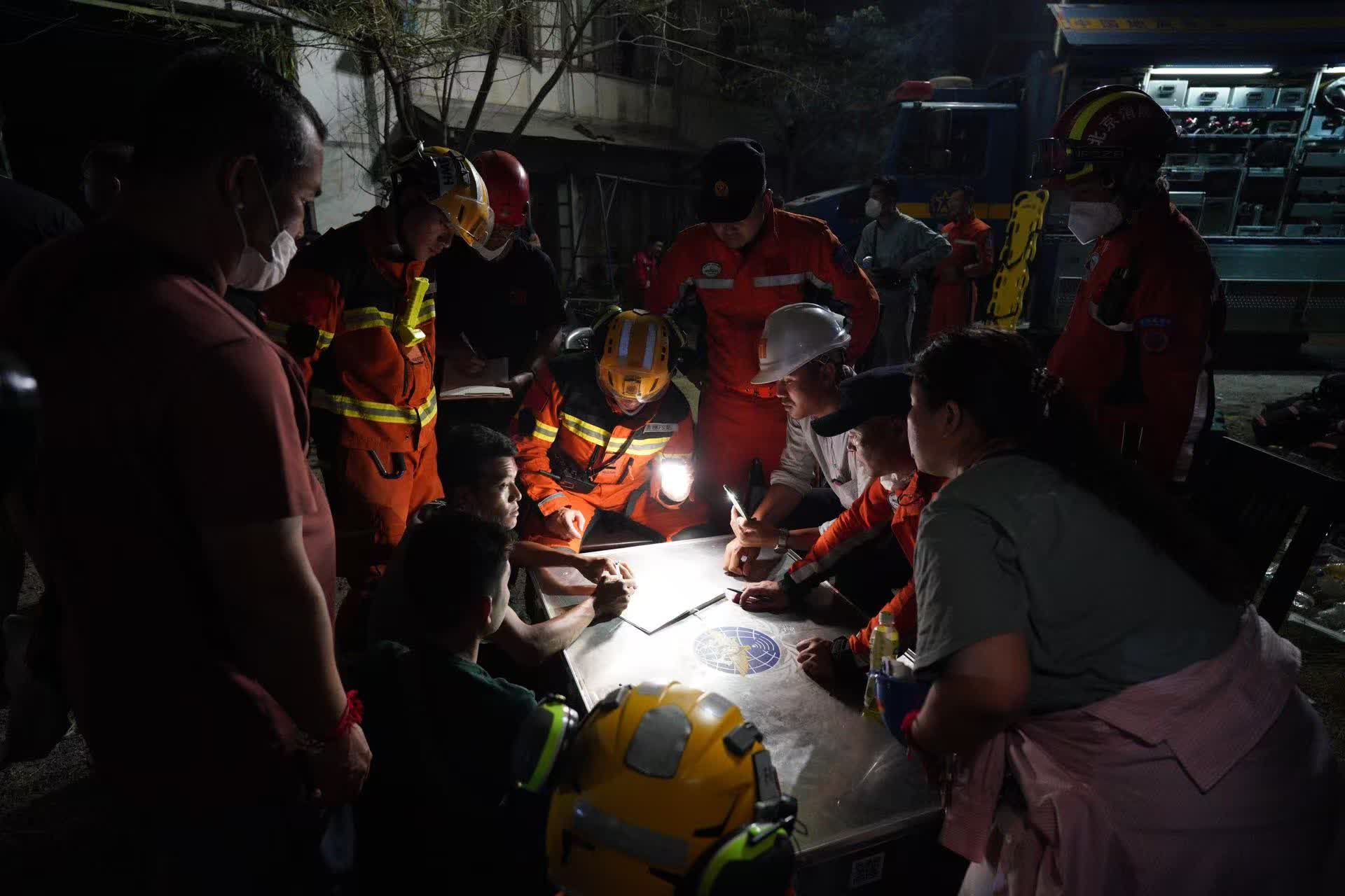 四支救援隊伍立刻分工合作,向可能有生還者的區域搜索。其中,香港特區救援隊帶備大量救援器材,今次救援行動中會負責搜救與爆破工作,搜救犬亦在現場不斷尋找生還者氣息。就在剛剛,救援隊在和酒店老闆一起排查所有酒店房間的客人,確認下還有多少酒店住客地震後未有逃生。