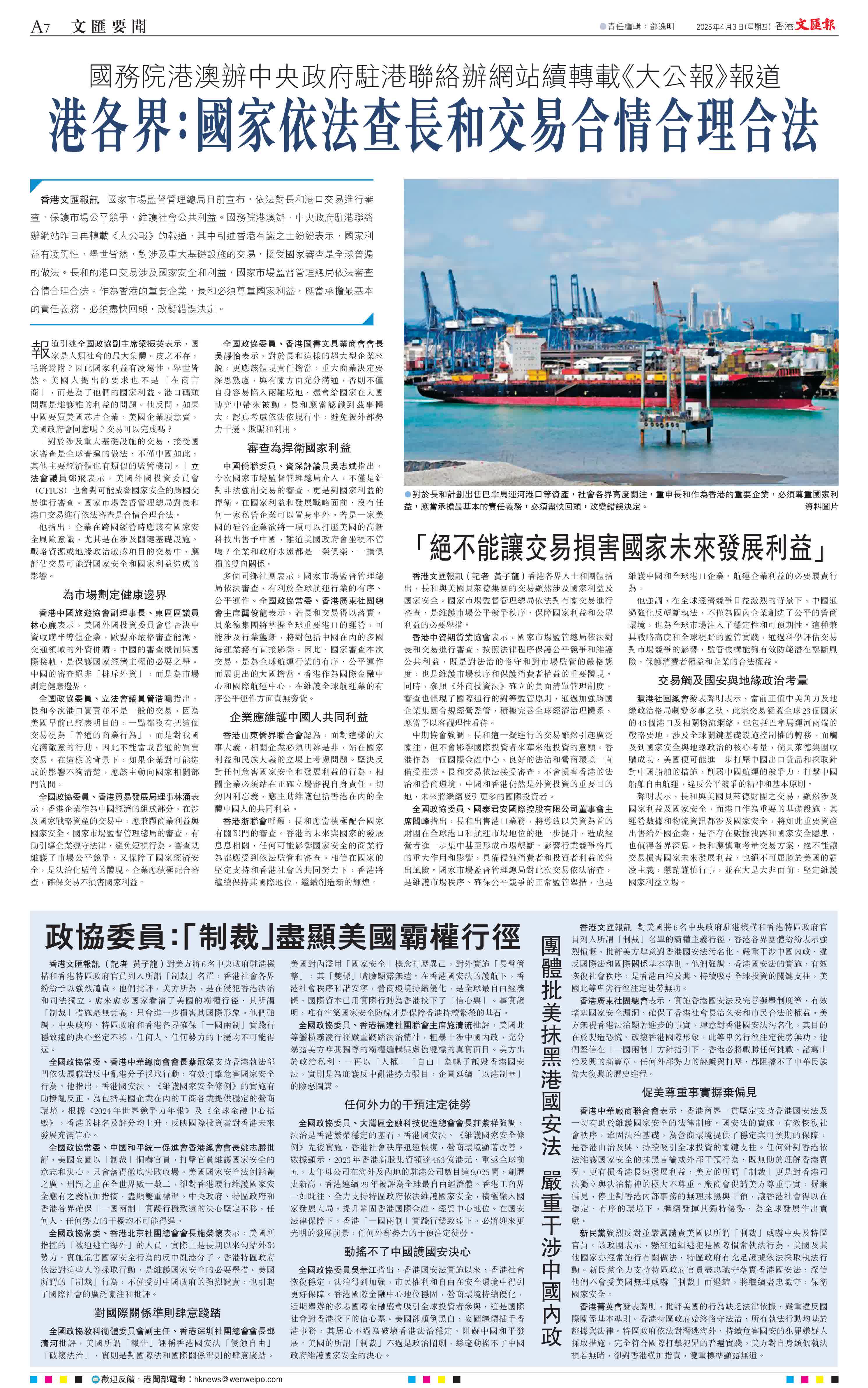 「對於涉及重大基礎設施的交易,接受國家審查是全球普遍的做法,不僅中國如此,其他主要經濟體也有類似的監管機制。」立法會議員鄧飛表示,美國外國投資委員會(CFIUS)也會對可能威脅國家安全的跨國交易進行審查。國家市場監督管理總局對長和港口交易進行依法審查是合情合理合法。