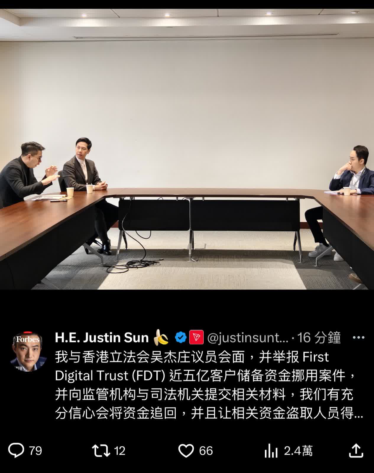 香港文匯報訊(記者 黎梓田)加密富豪、波場TRON創始人孫宇晨在X平台發文表示,「我與香港立法會吳傑莊議員會面,並舉報First Digital Trust (FDT)近五億美元客戶儲備資金挪用案件,並向監管機構與司法機關提交相關材料,我們有充分信心會將資金追回,並且讓相關資金盜取人員得到法律追究。」
