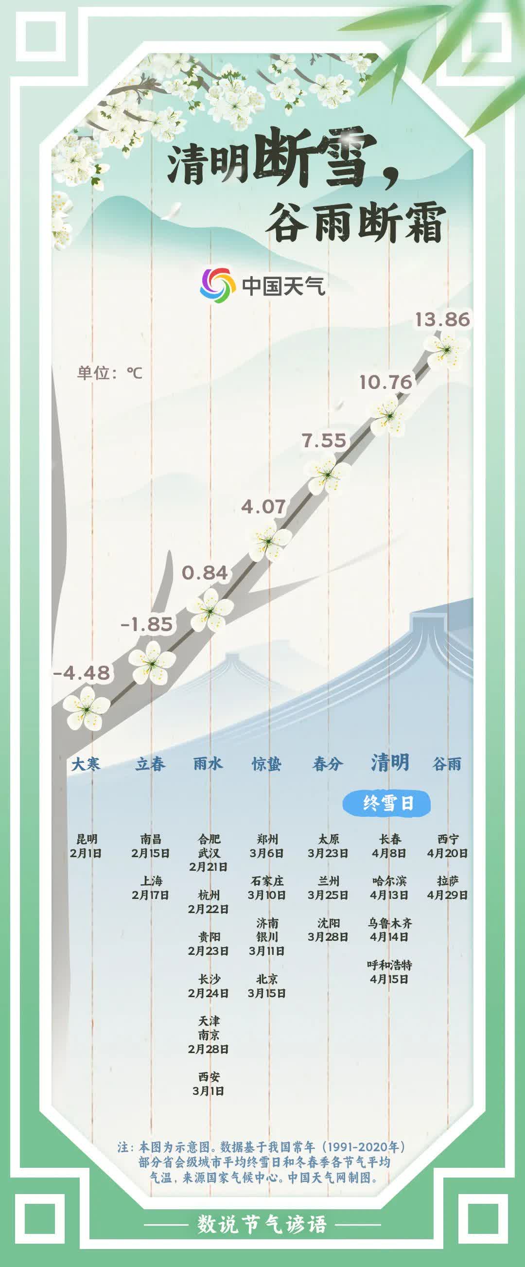 清明之後不再下雪了嗎?對我國不少地區而言,「清明斷雪」確實是成立的。中國天氣網統計常年(1991至2020年)省會級城市平均終雪日發現,上海、杭州、北京、瀋陽等19個城市均在清明節氣之前就陸續迎來終雪日,長春、哈爾濱、烏魯木齊、呼和浩特的終雪日則在清明節氣期間,僅有西寧、拉薩的終雪日在穀雨節氣。