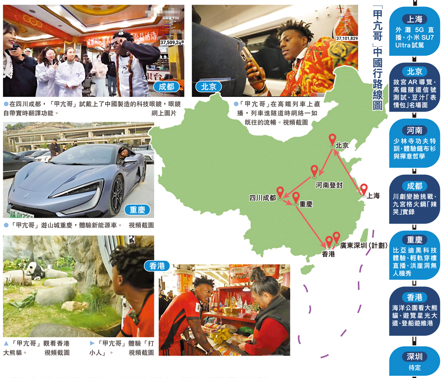 香港文匯報訊(記者 孟冰 重慶報道)因直播時情緒亢奮、表情生動、肢體語言誇張,被中國網友戲稱為「甲亢哥」的YouTube頂流網紅IShowSpeed(以下稱「甲亢哥」)3月24日起開啟了中國行,並於4月4日出現在香港街頭。從上海外灘的摩天大樓到成都巷弄的川劇變臉,從河南少林寺的硬功夫到重慶的穿樓輕軌……他在直播中「無劇本、無濾鏡」沉浸式體驗當地文化,用誇張表情和觀眾進行實時互動,向世界展現了一個真實、立體、充滿科技感的中國。豐富多元的直播內容吸引了單場超700萬次的觀看,不少國際觀眾被中國的硬核高科技「圈粉」。