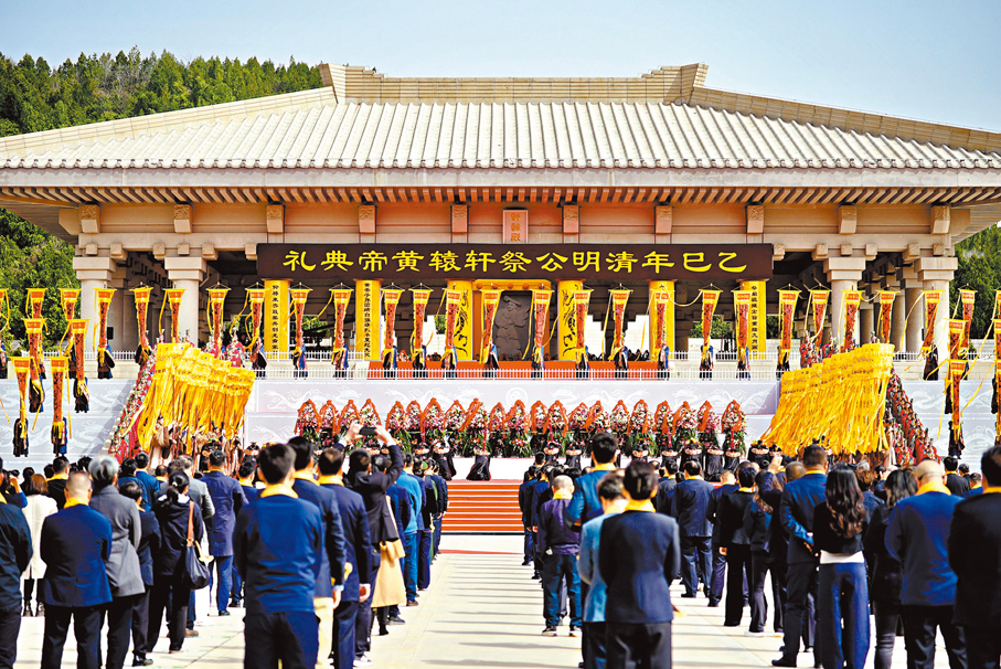 乙巳(2025)年清明公祭軒轅黃帝典禮由陝西省人民政府、國務院台灣事務辦公室、國務院僑務辦公室、中華全國歸國華僑聯合會共同主辦。上午9時50分,公祭典禮正式開始。全場肅立,擊鼓鳴鐘。擊響的34通鼓聲象徵着全國34個省、自治區、直轄市、香港、澳門特別行政區和台灣地區以及海內外中華兒女崇敬初祖的共同心聲;9響鐘鳴代表了中華民族傳統禮儀的最高禮數,表達全體中華兒女對人文初祖軒轅黃帝的無限景仰和無比感恩。120名身着禮服的男女合唱隊員與120名身着56個民族服裝的少年兒童齊唱《黃帝頌》,樂聲響徹橋山沮水。