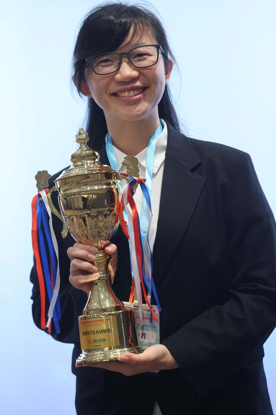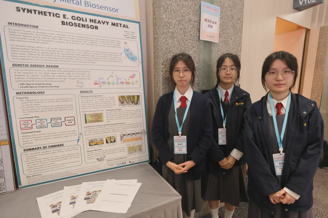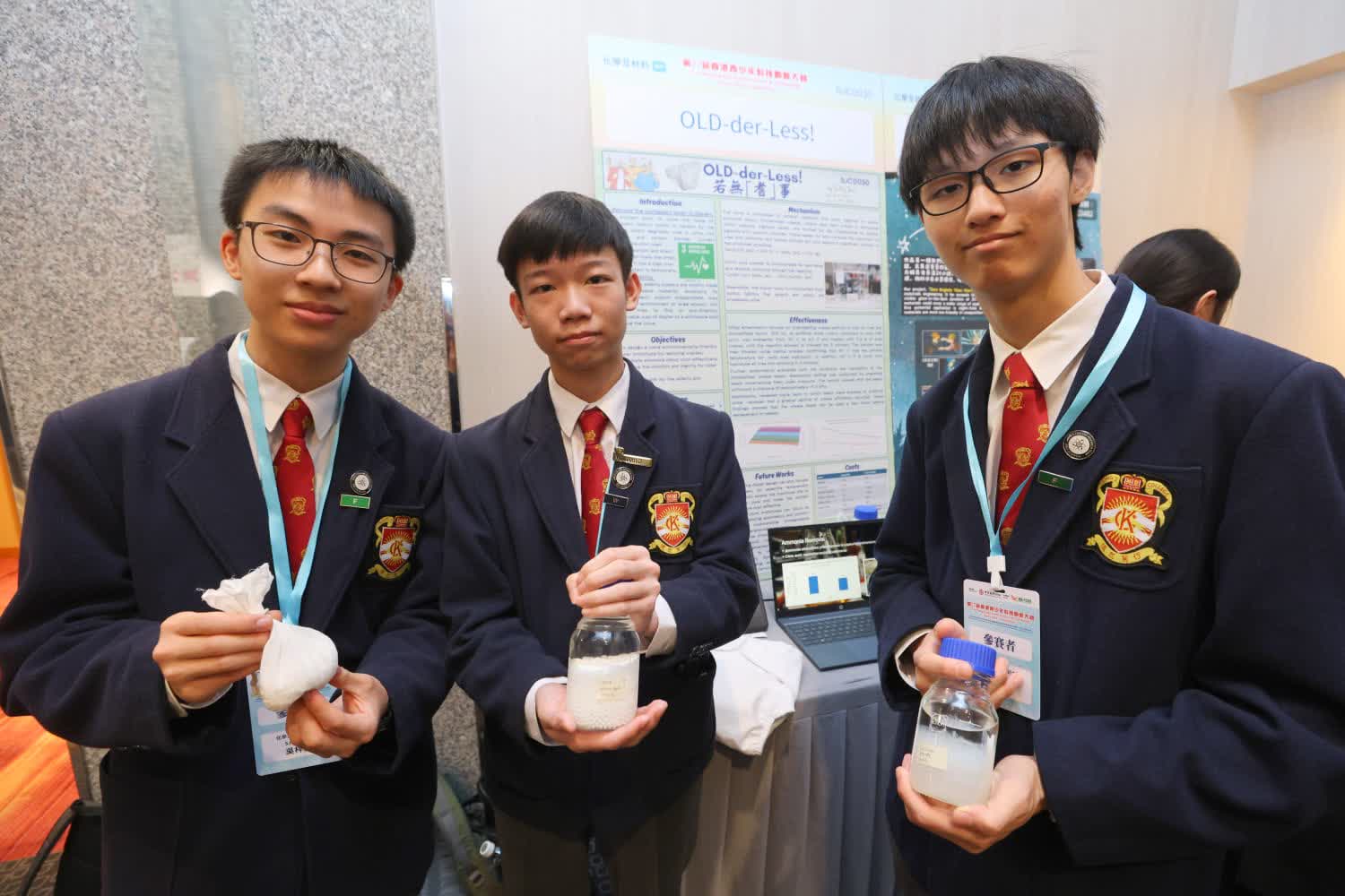 英皇書院學生吳梓銘、凌哲及劉思翰在「研究及發明」類別中,憑作品「OLD-der-Less!」(若無「耆」事),於「化學及材料」初中組獲得一等獎。吳梓銘表示,靈感源於家中長者使用成人尿片時,因尿片長時間悶著而滋生細菌,導致尿素分解產生氨氣,進而散發臭味並刺激皮膚。此外,隨著香港人口老化加劇,他們關注即棄尿片可能帶來的環境污染問題,因而構思出一款無異味、成本低且環保的尿片。其核心技術是加入小豆子形狀的海藻酸鈣,用以固定化脲酶,快速分解尿素中的氨氣;再加入檸檬酸中和氨氣的鹼性,從而有效消除臭味。這些小豆子可重複使用約五次,未來團隊將專注於尿片內PH值的管理,並計劃將具除臭功能的小豆子應用於尿袋中。英皇書院化學科老師梁英豪透露,該計劃自去年9月開始,歷時約半年完成。學生每天放學後便前往實驗室進行構思與製作。