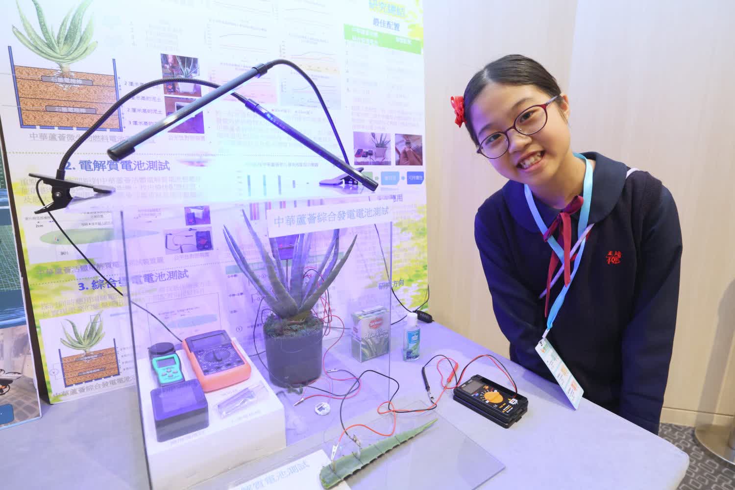 香港培正小學六年級學生楊曉悅憑研究「中華蘆薈活體綜合發電電池的可行性」,在小學研究論文組別中榮獲冠軍。楊曉悅表示,她透過網上資料了解到植物發電的概念,於是展開研究,假設植物微生物燃料電池與植物電解質電池的科學原理能夠結合,並在同一單體植物內同時運作。研究結果顯示,該綜合發電系統能產生更多電力,足以為簡單的電子時鐘提供動力。