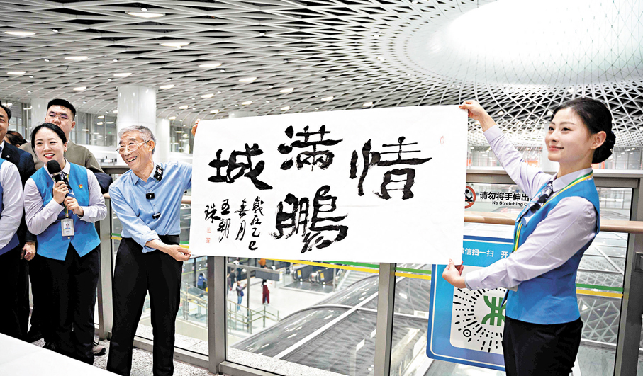 「姥爺」此行還特地打卡了有着地鐵「顏值天花板」之稱的崗廈北樞紐,現場感受了深圳地鐵和城市建築科技藝術之美,點讚稱「很高級,很有科技感。」為了表達謝意,「姥爺」現場揮毫潑墨寫下「情滿鵬城」。