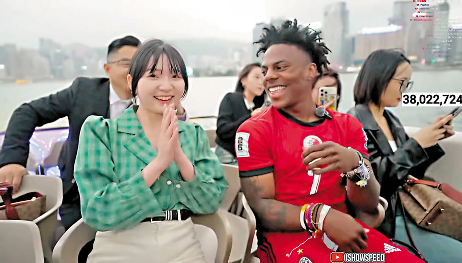 YouTube頂流網紅IShowSpeed「甲亢哥」在香港的行程中,一位來自浙江紹興的女生意外成為社交媒體的熱點話題。在維港坐船觀光期間,這位女生主動與「甲亢哥」攀談,「甲亢哥」誇讚她的聲音很像動漫角色的聲音,非常cool,女生表示曾因此被人嘲笑。為了開解她,「甲亢哥」講述自己因膚色遭受歧視的經歷,並告訴她要做自己,不要在意別人的看法。女生還大大方方地站起來給大家展示她會的中國功夫,「甲亢哥」也跟着模仿起「蛇拳」「螳螂拳」,兩人一邊互相學習一邊切磋,引得船上旅客們笑聲不斷。得知過幾天就是女生的生日,「甲亢哥」掏出海賊王路飛的手辦送給她留作紀念。女孩在包包裏尋找能回禮的東西未果,遺憾地表示:「沒有東西送了,但是中國人講究禮尚往來……」女生的落落大方、自然有趣的互動如清風拂面,成功讓「甲亢哥」這場緊繃的香港直播鬆弛下來,有觀眾大讚女孩「如天使般拯救了整場直播」。當晚,「甲亢哥香港行最好的22分鐘」也登上了內地社媒熱搜。