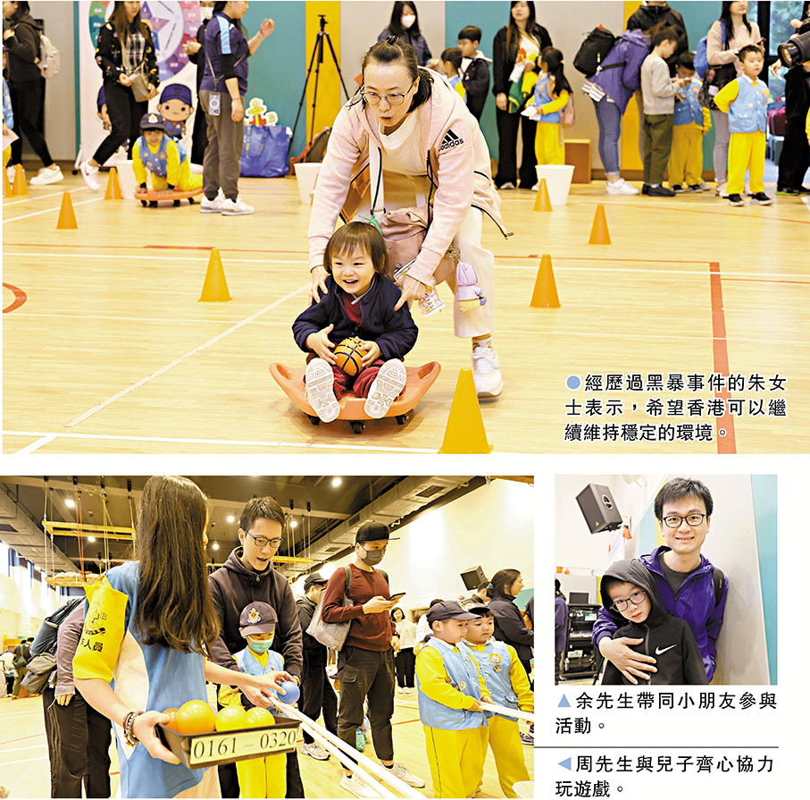 朱女士專程帶同3歲女兒及9歲兒子參與活動,讓他們透過玩遊戲學習和認識國家安全知識。其兒子也分享了自己通過玩套圈及滾皮球的遊戲,學習到文化安全、政治安全、深海安全等知識。曾經歷過黑暴事件的她表示,希望香港可以繼續維持穩定的環境,讓孩子們可以在安全環璄下健康成長。