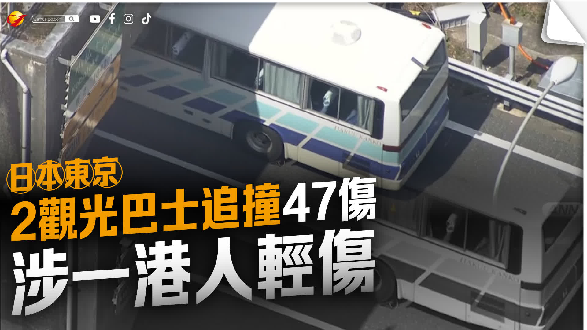 日本東京都八王子市中央自動車道南下路段周六(5日)早上發生觀光巴士追撞事故,造成47名乘客受傷。消息指,被追撞的觀光巴士上有6名香港人。入境處表示,至今接獲一宗相關求助,涉及一名港人受輕傷,毋須住院。