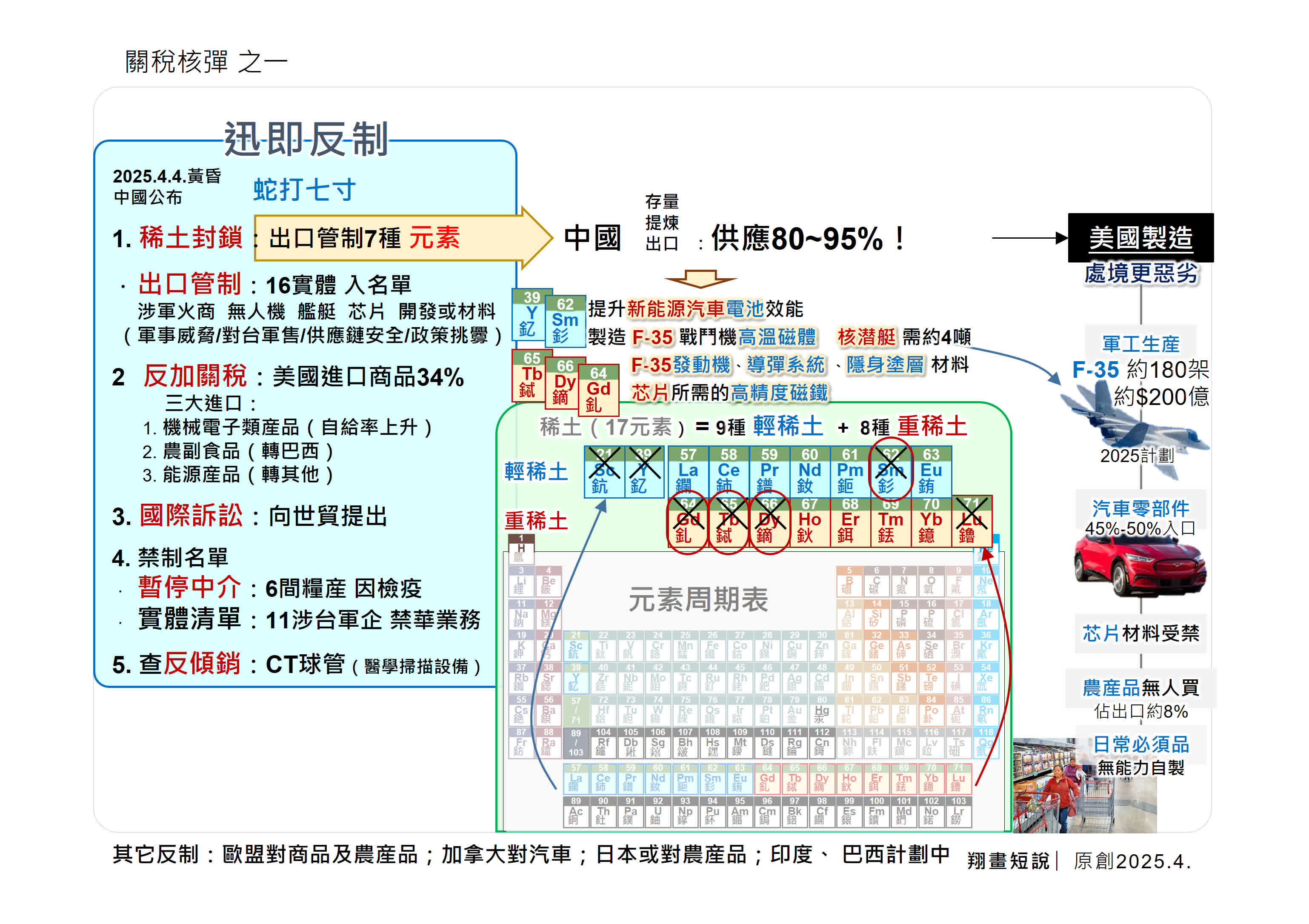 不足48小時內,中國雷霆反擊,公布多項反制措施。稀土出口管制:對 16 家涉及軍工、無人機、芯片開發等領域的美國實體,限制 7 種稀土元素出口。由於中國稀土提煉量佔全球 80%-95%,直接影響美國軍工產業,例如 F-35 戰機的高溫磁體和核潛艇的關鍵材料供應面臨風險;關稅報復:對美國機械電子、農副產品等進口商品加徵 34% 關稅,並暫停 6 家美國糧企的檢疫許可,對 11 家涉台軍工企業實施業務禁令。