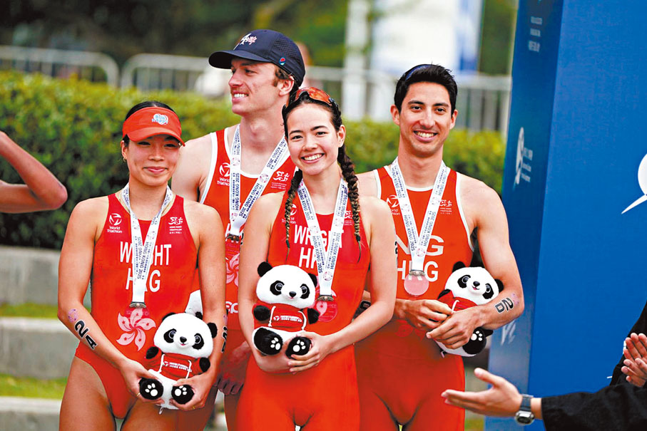 一連兩日在維港賽道上演的亞洲三項鐵人半奧運距離錦標賽,於昨日(6日)煞科日進行混合接力賽,港隊派出兩支隊伍迎戰,最終由巴黎奧運會代表伍泰龍、韋祺、韋禔及亞青金牌Robin Elg組成的香港一隊奪得混合接力賽季軍,國家隊及日本隊分別奪得冠、亞軍。●圖/文:香港文匯報記者 葉詩敏