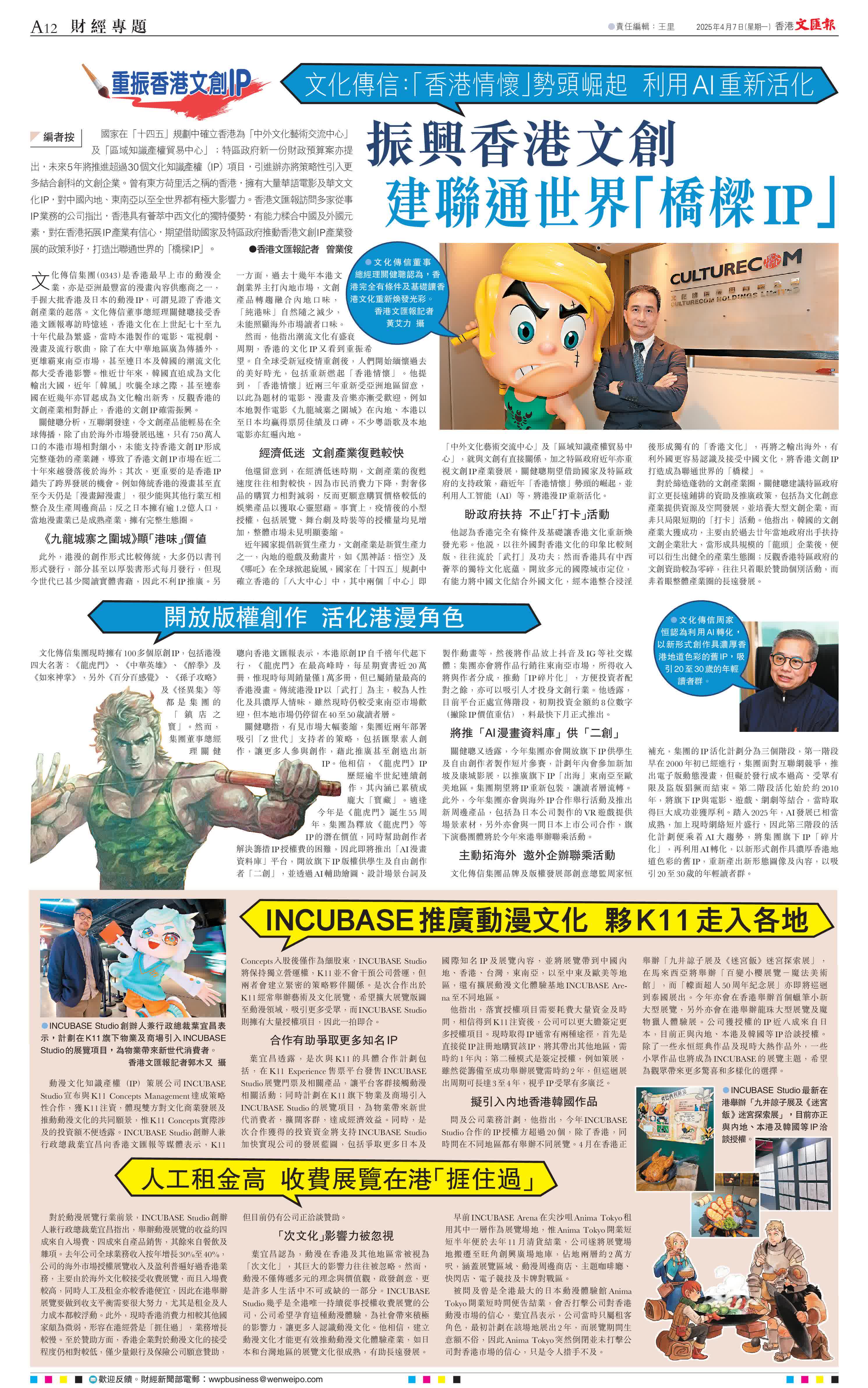 近年國家提倡新質生產力,文創產業是新質生產力之一,內地的遊戲及動畫片,如《黑神話:悟空》及《哪吒》在全球掀起旋風,國家在「十四五」規劃中確立香港的「八大中心」中,其中兩個「中心」即「中外文化藝術交流中心」及「區域知識產權貿易中心」,就與文創有直接關係,加之特區政府近年亦重視文創IP產業發展,關健聰期望借助國家及特區政府的支持政策,藉近年「香港情懷」勢頭的崛起,並利用人工智能(AI)等,將港漫IP重新活化。