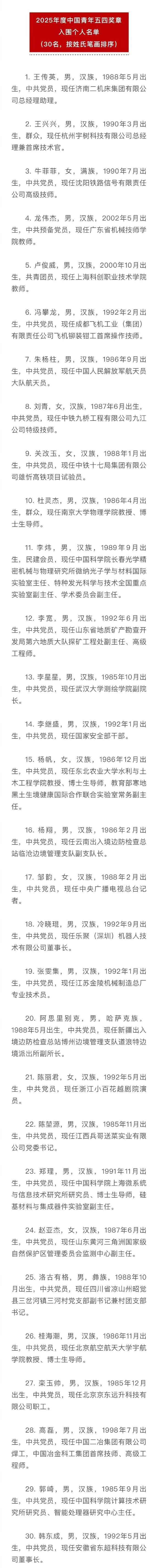 據共青團中央消息,2025年度中國青年五四獎章入圍名單公示。其中,宇樹科技創始人王興興、浙江小百花越劇院演員陳麗君、航天員朱楊柱和桂海潮、央視記者鄒韻等人在列。