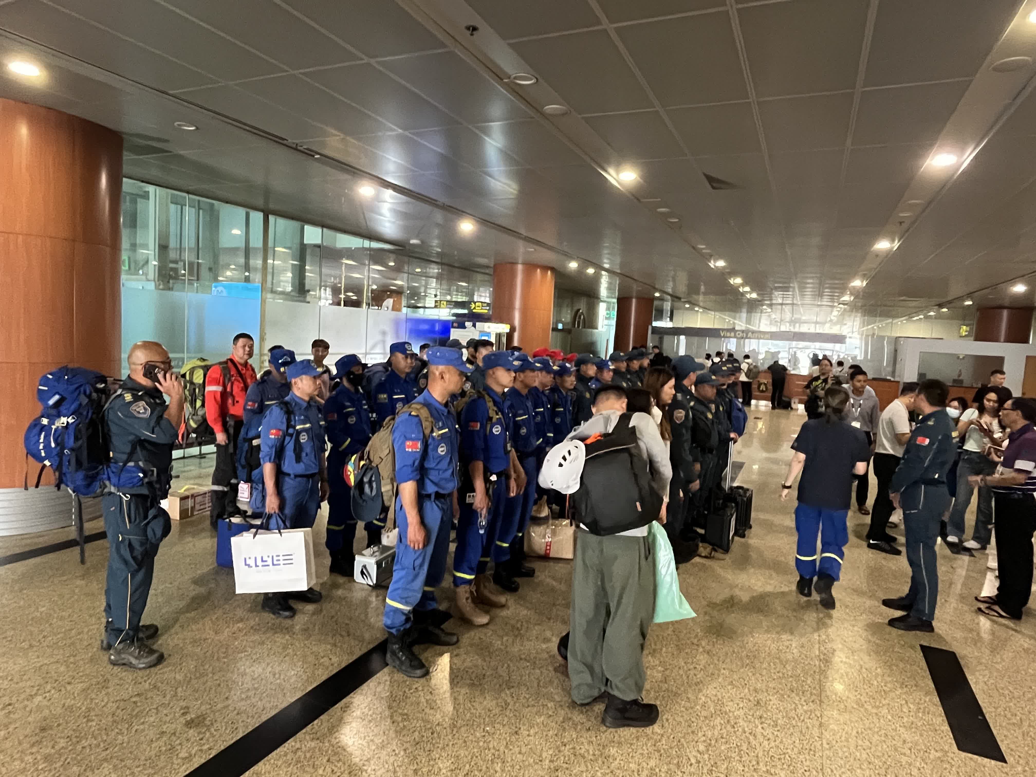 我們辦完入境的落地簽後,就開始了忙碌而緊張的工作。在辦好各種證件之後,我們已經在到達大廳等待中國藍天救援隊的到來。我看到他們的飛機降落在仰光機場的跑道上,懷着緊張的心情準備對他們進行抓拍。很快這班飛機的人陸續從飛機上下來,藍天救援隊的隊員們是在旅客們全部出來之後,排着隊有序地走出來。在看到他們的一瞬間,我不知道為什麼,我眼角竟然濕潤了起來。可能是被他們英勇無畏的精神所打動。此刻作為一個記錄者,我沒有時間處理我的情緒,我知道我必須馬上把這些畫面拍下來。看到他們每一個人,我恨不得想把每一個人的精神狀態都拍下來。