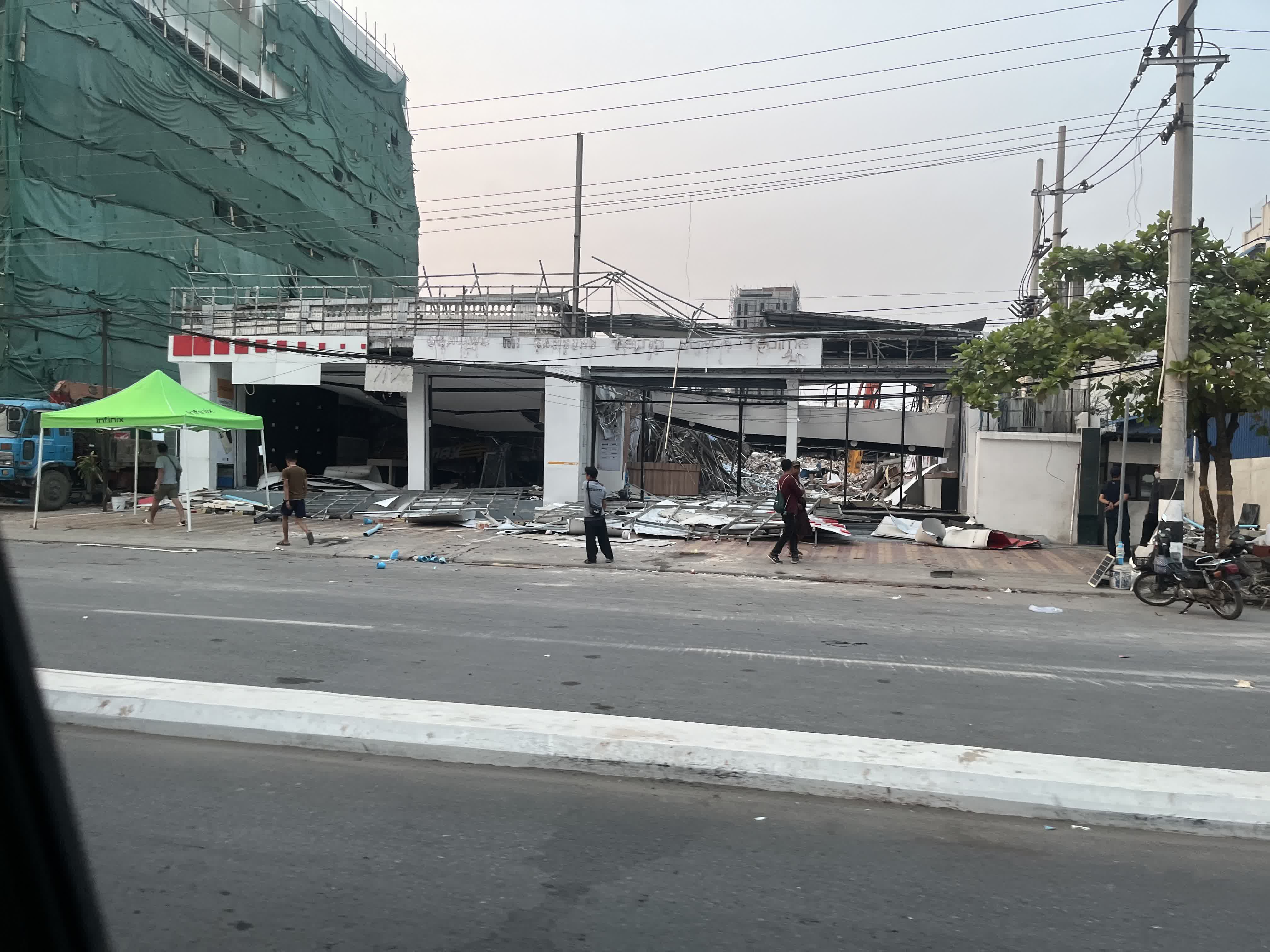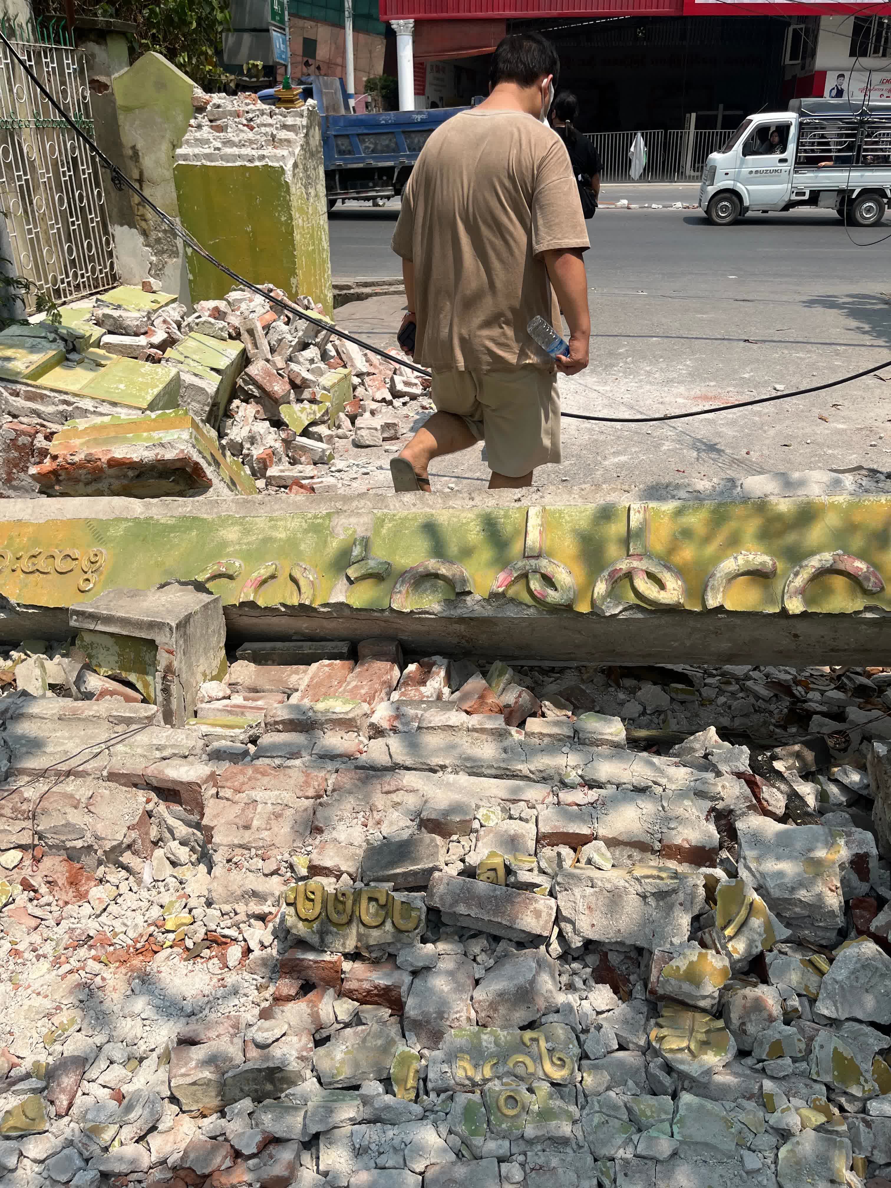 經過13個小時的車程,我們懷着緊張及擔憂的心情,進入了曼德勒。從城外往城內去,倒塌的建築越來越多;從偶爾能看見一些傾斜的建築,到越來越多倒塌的建築。曼德勒城內的情況雖不至於像傳聞中那麼誇張,但有些樓的狀況看起來確實有些慘烈,如果說在地震的瞬間,這些樓就迅速倒塌的話……看到這些我真的不敢再想了。