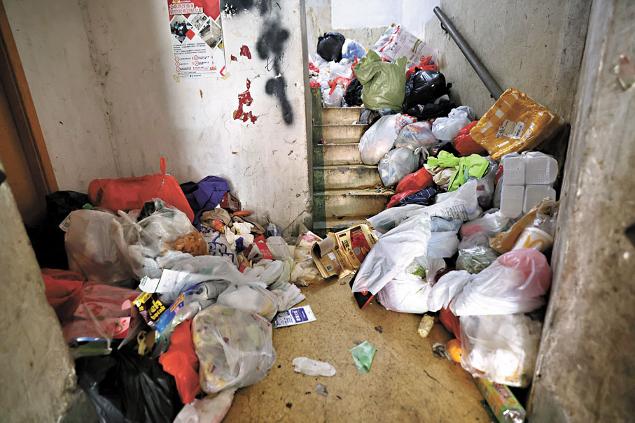 九龍深水埗一棟逾60年樓齡的「三無大廈」,過往依賴住戶集資聘請「垃圾姐姐」處理垃圾,惟最近因大部分業主拒絕再夾錢,導致梯間堆積大量廚餘、尿片等生活垃圾無人清理,散發惡臭,隨時可能衍生社區播菌危機。有業主昨日向香港文匯報表示,過往住戶一般會將垃圾扔到附近垃圾站,但近年接連有單位變為劏房,品流複雜,缺德住戶亂棄垃圾,清潔工憤然辭職,梯間垃圾堆積如山。香港文匯報介入後,關愛隊及當區區議員伸出援手協助清理垃圾,但他們表示清理只能解燃眉之急,需要透過成立法團及修例等手段治本。 ●香港文匯報記者 蕭景源、黃子龍