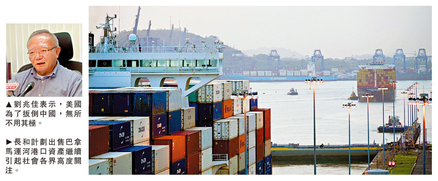 (大公報記者 龔學鳴)長江和記公司計劃出售巴拿馬運河港口等資產一事,連日來引起社會各界持續高度關注。全國港澳研究會顧問劉兆佳昨日接受《大公報》訪問時表示,從商業角度看,這項交易的確讓長和獲利甚豐,但鑒於美國會變本加厲衝擊中國的造船業、航運業,以及「一帶一路」倡議,遏制中國的崛起,所以這項交易無可避免會對國家利益和國家安全帶來威脅。