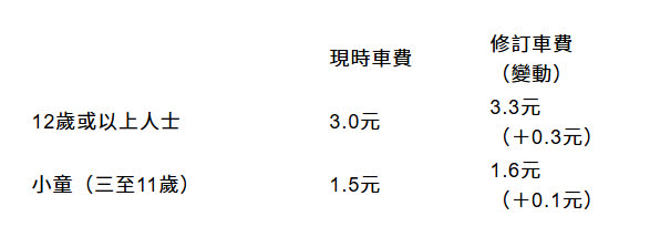 此外,長者(65歲或以上人士)的票價亦會由目前1.3元調高至1.5元,而現時票價為260元的月票,則維持不變。
