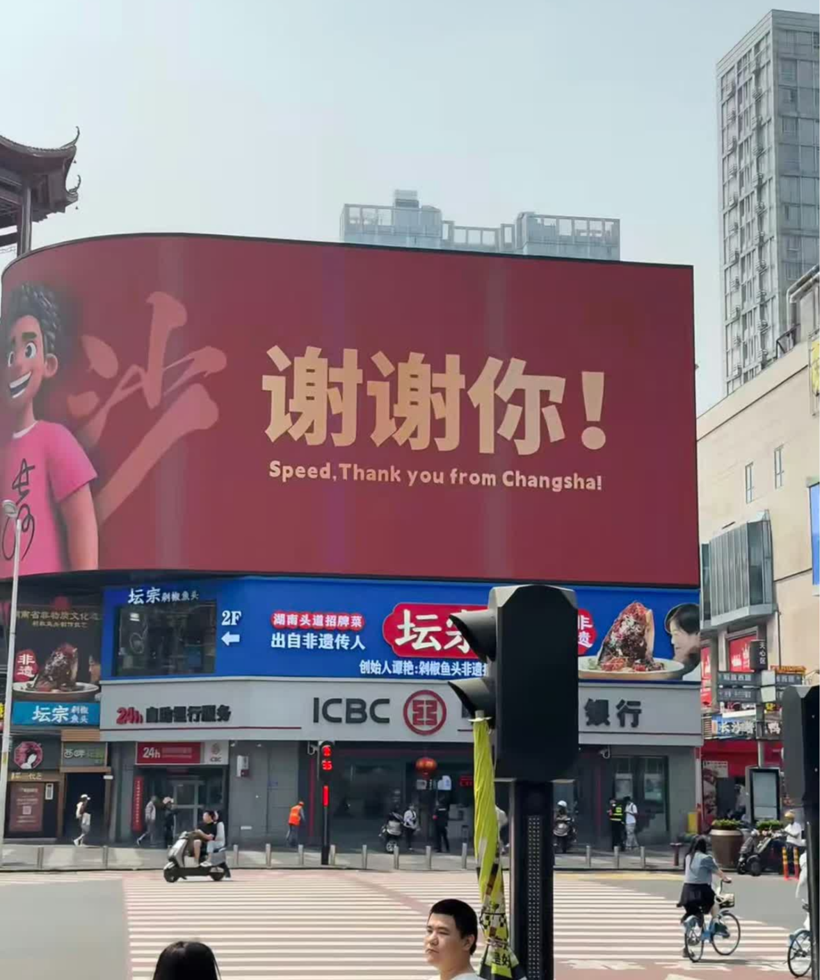 作為最後一站的長沙,也在市中心的大屏幕上做了廣告,表達對「甲亢哥」的感謝。