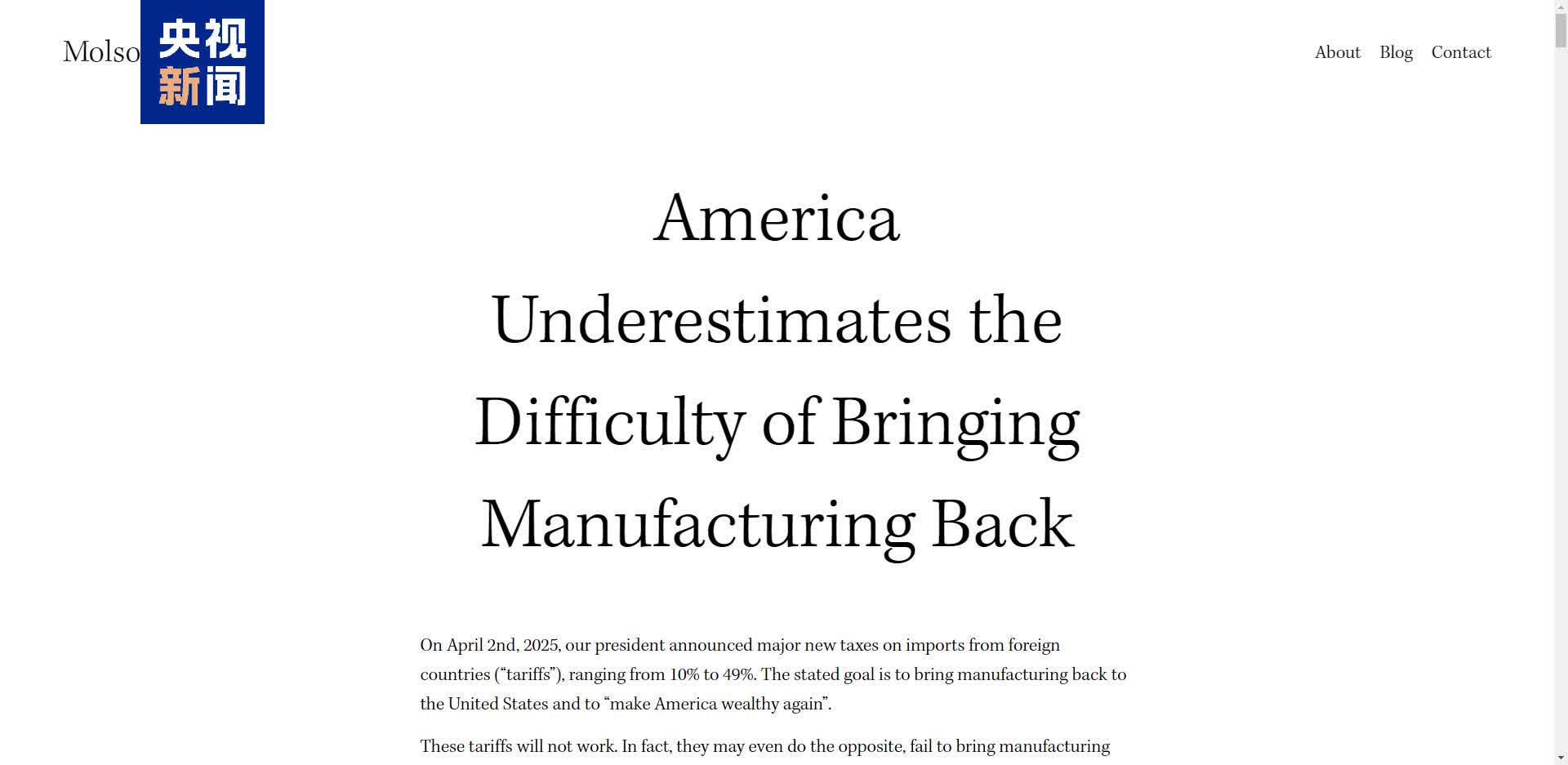 莫爾森在文章開頭寫道,特朗普宣布對進口商品加徵關稅的目標是讓製造業回流美國,以讓美國再次富裕。但他認為,這些關稅政策注定失敗,會起到適得其反的效果,並一氣兒甩出多個「硬核」理由: