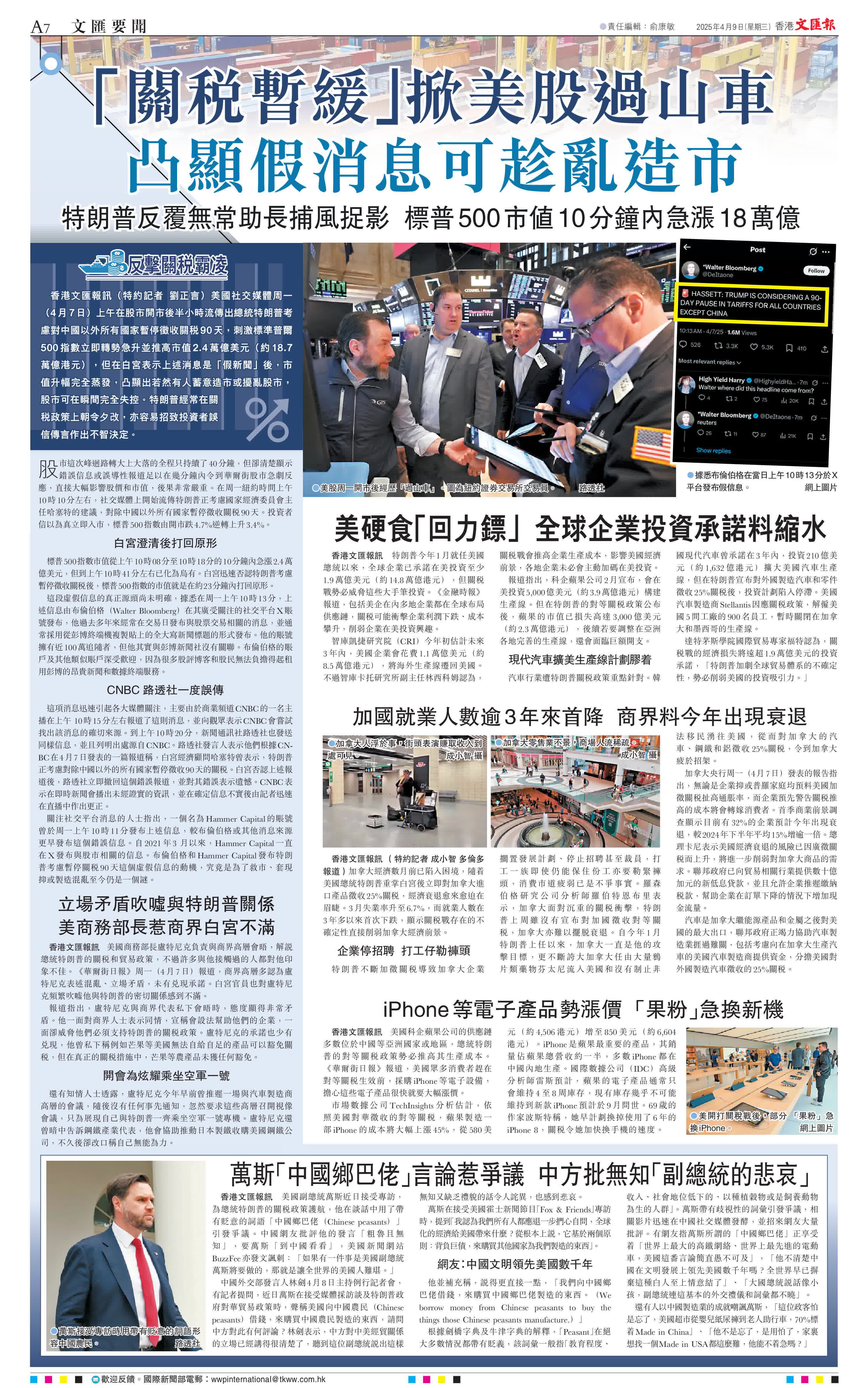 股市這次峰迴路轉大上大落的全程只持續了40分鐘,但卻清楚顯示錯誤信息或誤導性報道足以在幾分鐘內令到華爾街股市急劇反應,直接大幅影響股價和市值,後果非常嚴重。在周一紐約時間上午10時10分左右,社交媒體上開始流傳特朗普正考慮國家經濟委員會主任哈塞特的建議,對除中國以外所有國家暫停徵收關稅90天。投資者信以為真立即入市,標普500指數由開市跌4.7%逆轉上升3.4%。