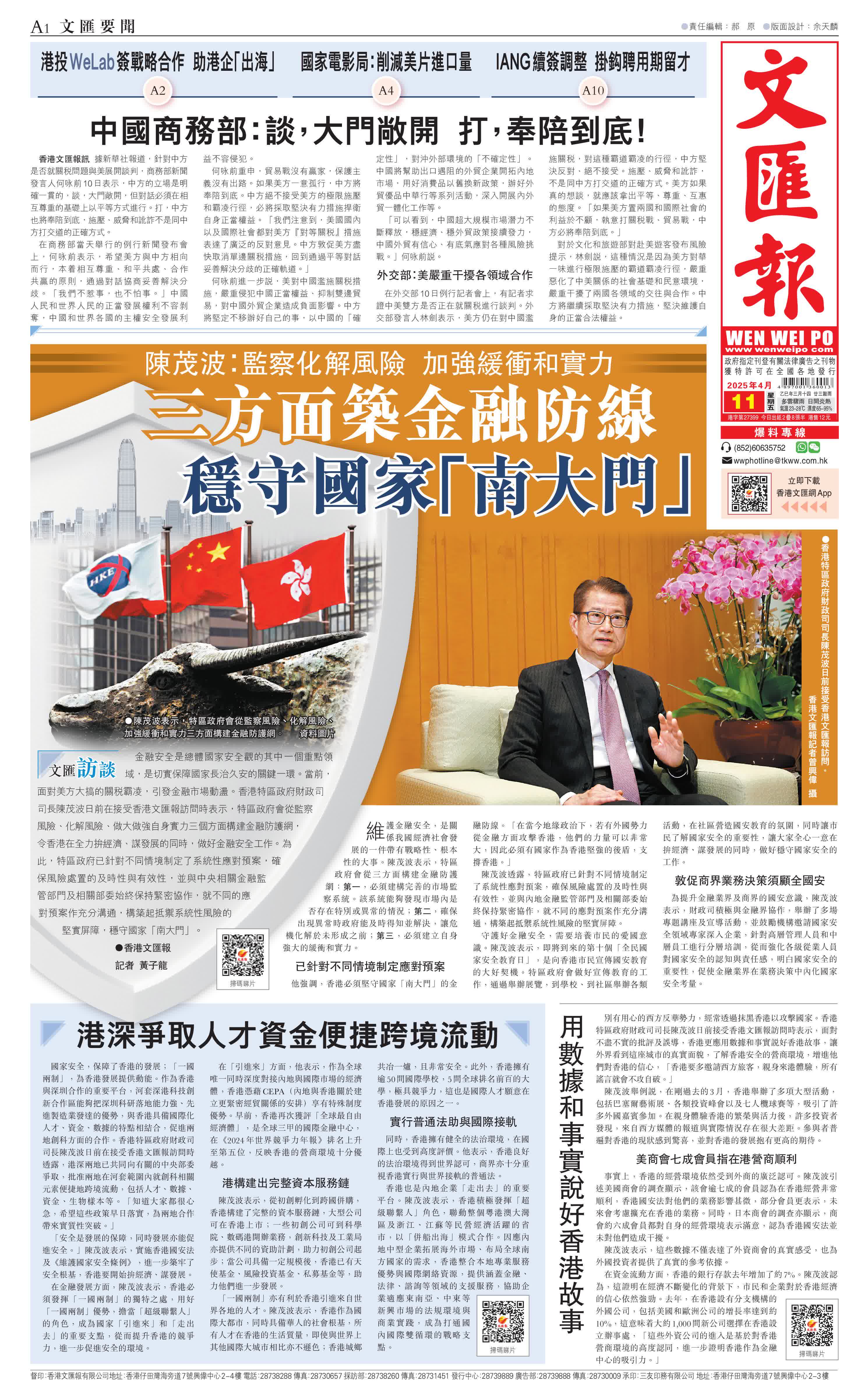(香港文匯報記者 黃子龍)金融安全是總體國家安全觀的其中一個重點領域,是切實保障國家長治久安的關鍵一環。當前,面對美方大搞的關稅霸凌,引發金融市場動盪。香港特區政府財政司司長陳茂波日前在接受香港文匯報訪問時表示,特區政府會從監察風險、化解風險、做大做強自身實力三個方面構建金融防護網,令香港在全力拚經濟、謀發展的同時,做好金融安全工作。為此,特區政府已針對不同情境制定了系統性應對預案,確保風險處置的及時性與有效性,並與中央相關金融監管部門及相關部委始終保持緊密協作,就不同的應對預案作充分溝通,構築起抵禦系統性風險的堅實屏障,穩守國家「南大門」。