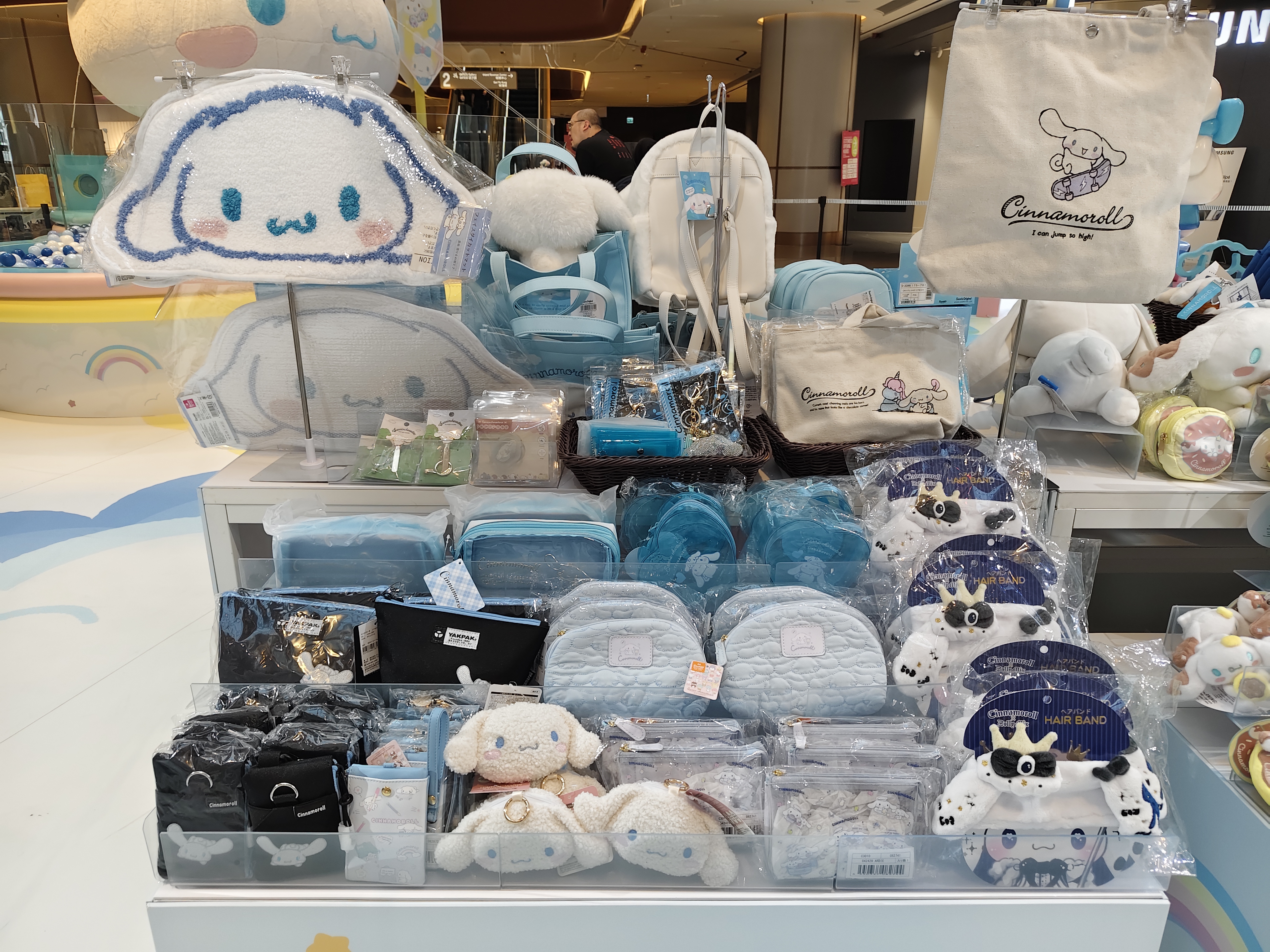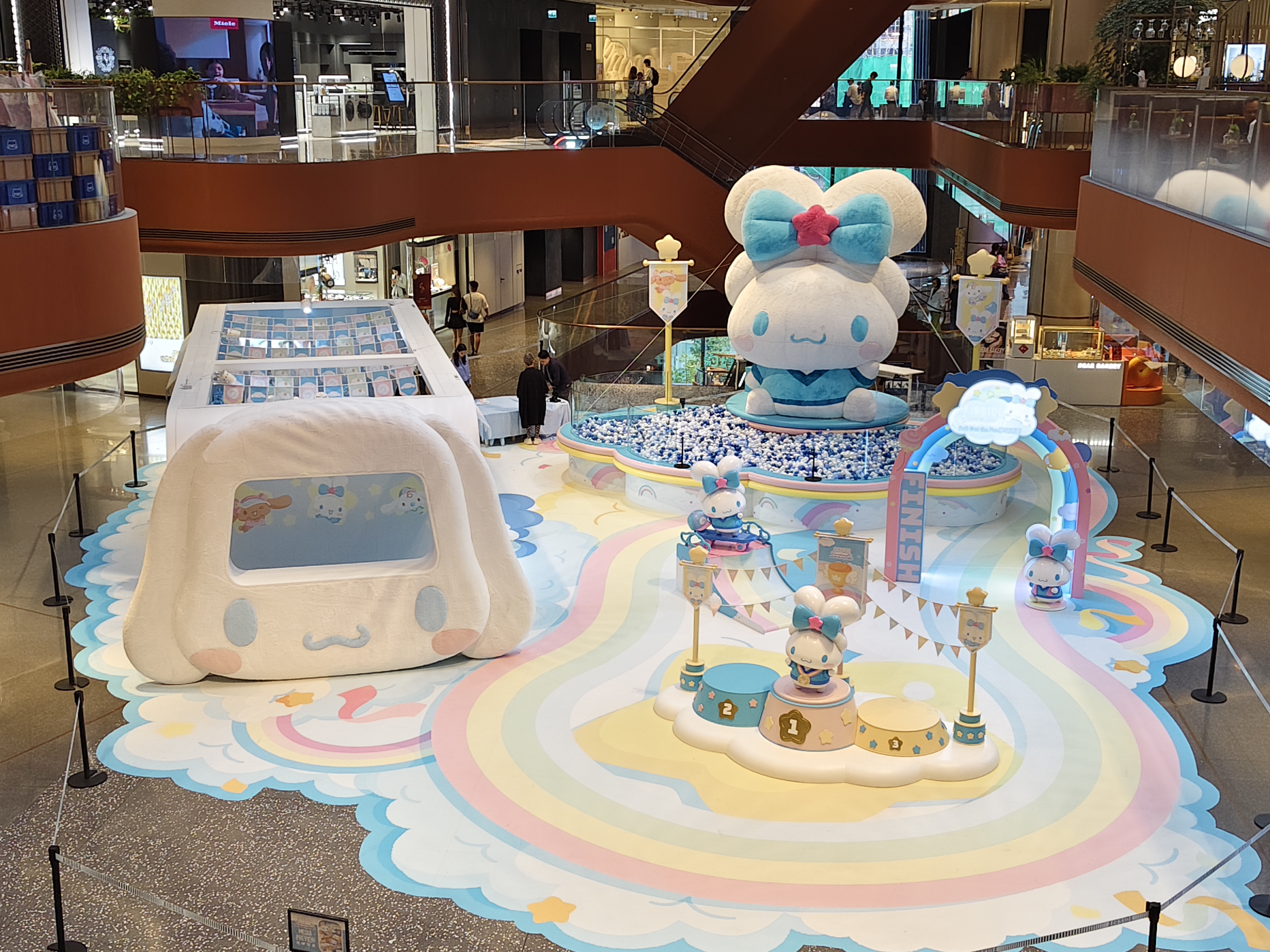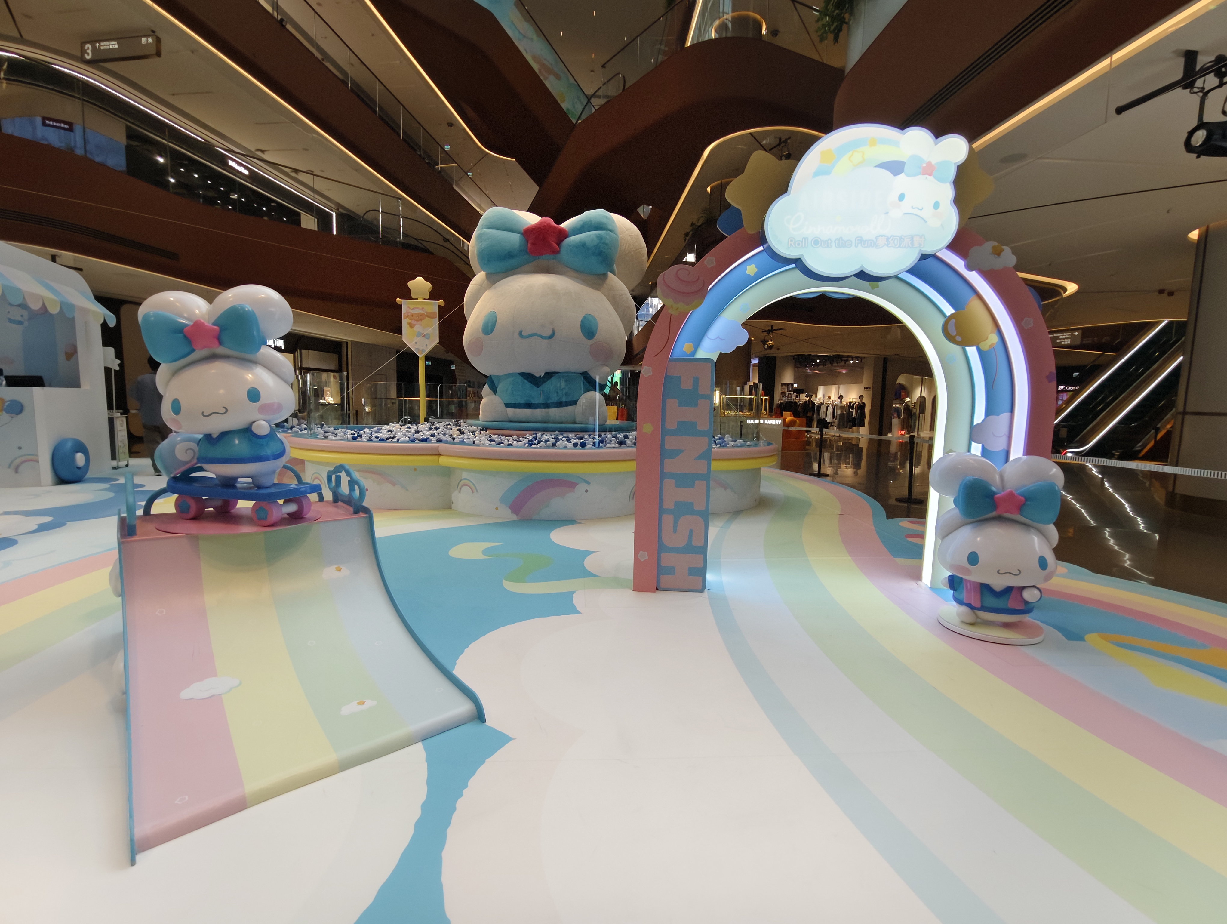 現場設有三大打卡位供大家拍照留念,包括高建五米毛越絨Cinnamoroll吹氣大型裝置及波波池、夢幻田徑場上Cinnamoroll衝刺終點圓拱、頒奬台與滑板場景,以及Cinnamoroll化身成Cafe餐車,發售獨家限量商品的期間限定店。