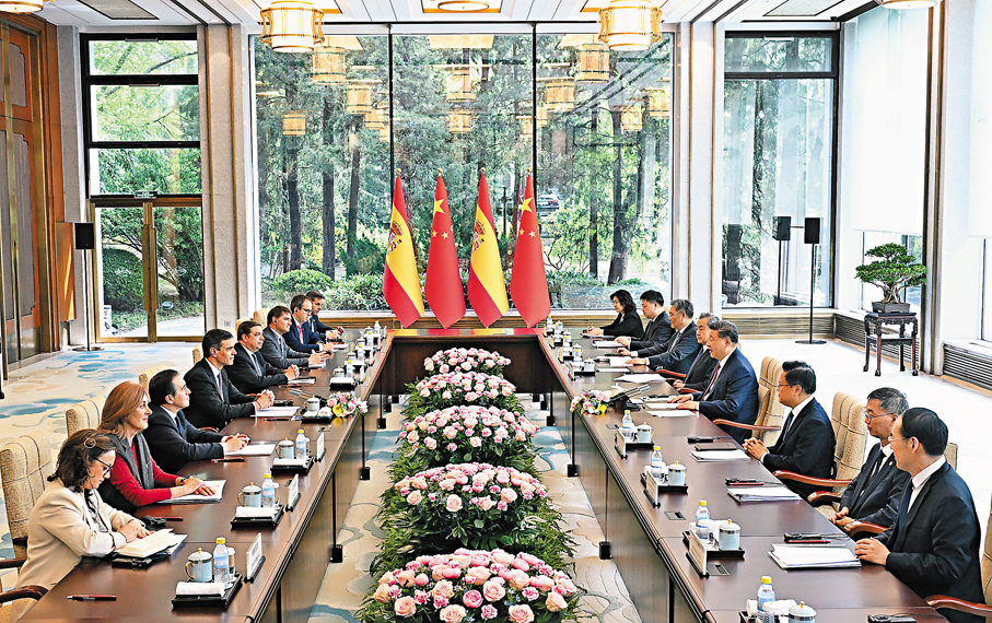 桑切斯表示,西班牙和中國建立全面戰略夥伴關係20年來,始終相互尊重、友好合作,兩國關係不斷深化發展。在習近平主席領導下,中國取得卓越發展成就,為世界繁榮穩定作出重大貢獻。西班牙重視對華關係,堅定不移奉行一個中國政策,願同中方保持高層交往,深化貿易、投資、科技創新、綠色能源等領域互利合作,加強教育、文化、旅遊領域交流,推動兩國關係邁上新台階。中國是歐盟重要合作夥伴,西班牙始終支持歐中關係穩定發展。歐方堅持開放自由貿易,致力於維護多邊主義,反對單邊加徵關稅。貿易戰不會有贏家。面對複雜嚴峻的國際形勢,西班牙和歐盟願與中方加強溝通協作,維護國際貿易秩序,攜手應對氣候變化、貧困等挑戰,維護國際社會共同利益。